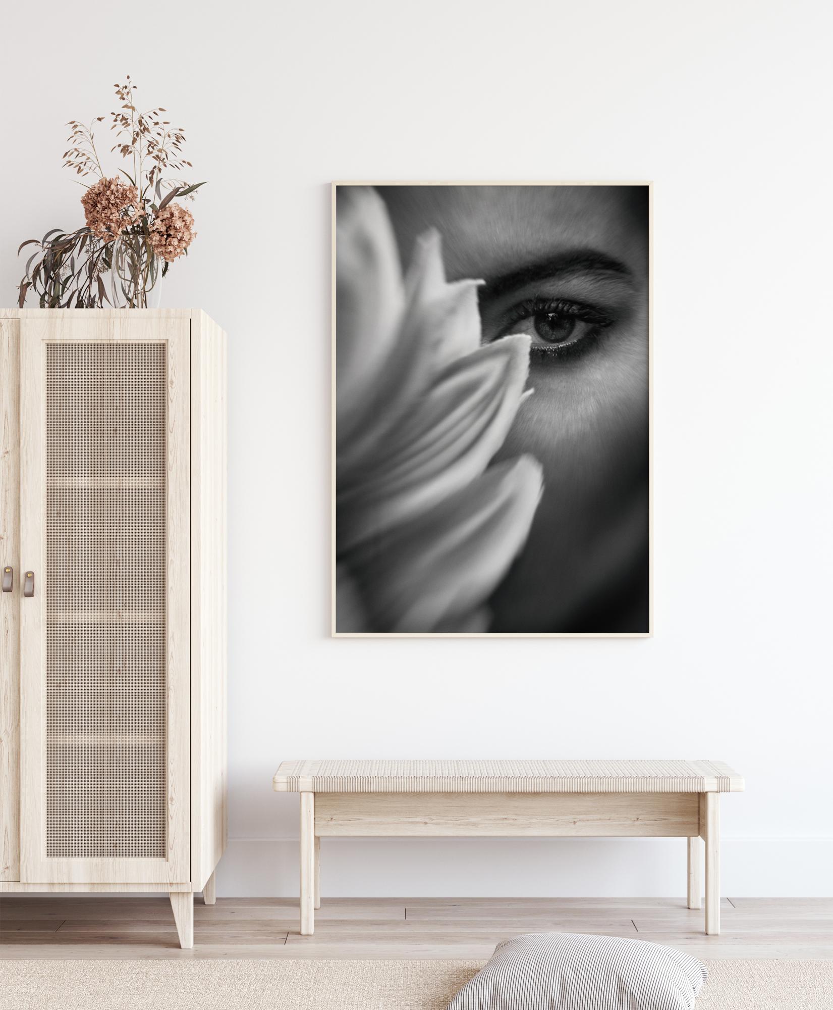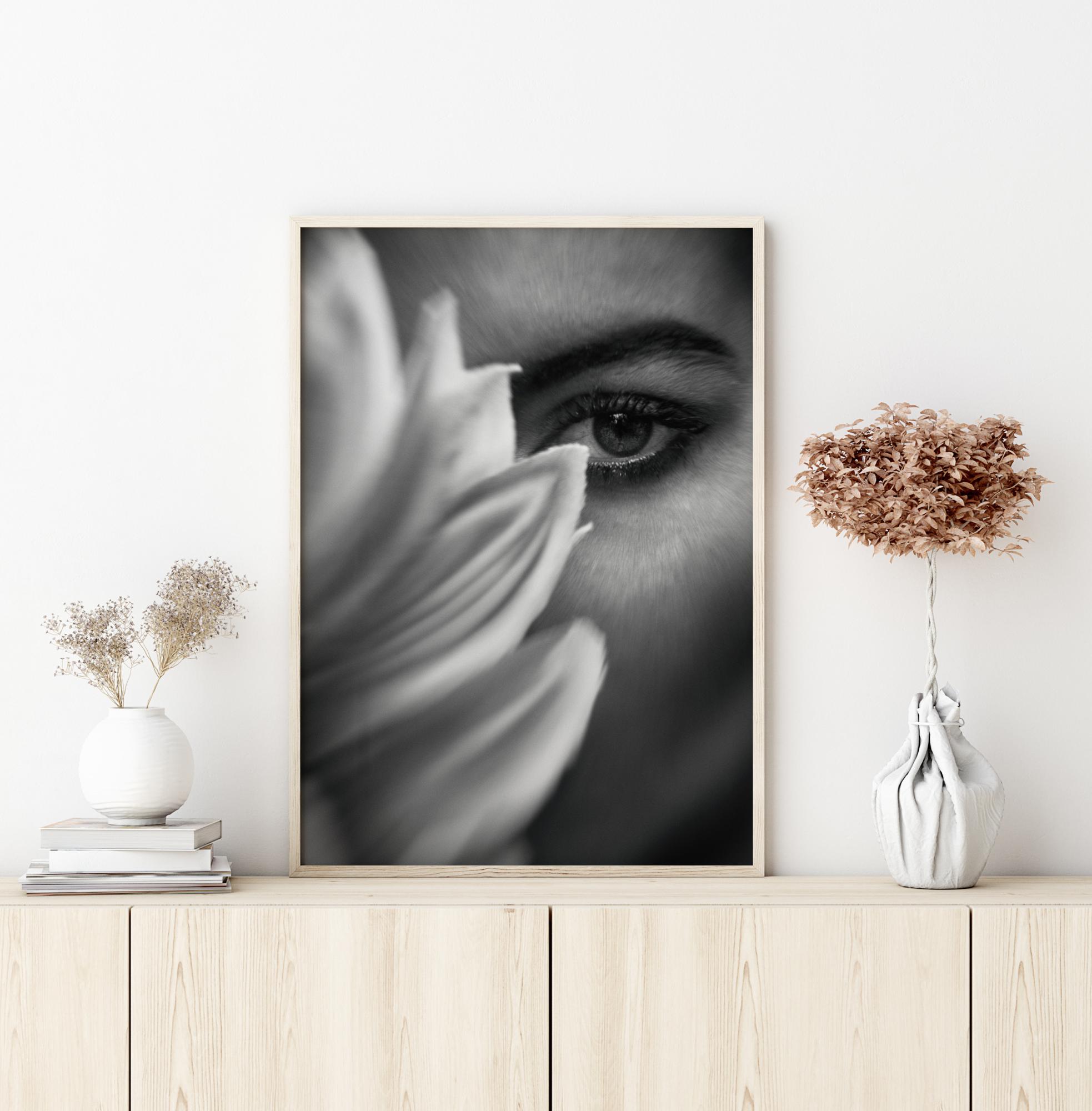 Μια φανταστική αφίσα με ένα λουλούδι και ένα γυναικείο μάτι σε κοντινό πλάνο. Οι απαλές ασπρόμαυρες αποχρώσεις την κάνουν να ξεχωρίζει ανάμεσα σε όλα τα χρώματα. Μετατρέψτε οποιοδήποτε δωμάτιο σε ένα ήρεμο μέρος για πνευματική παρατήρηση.