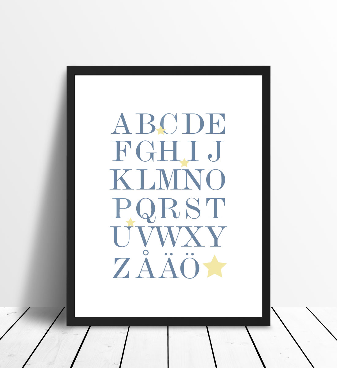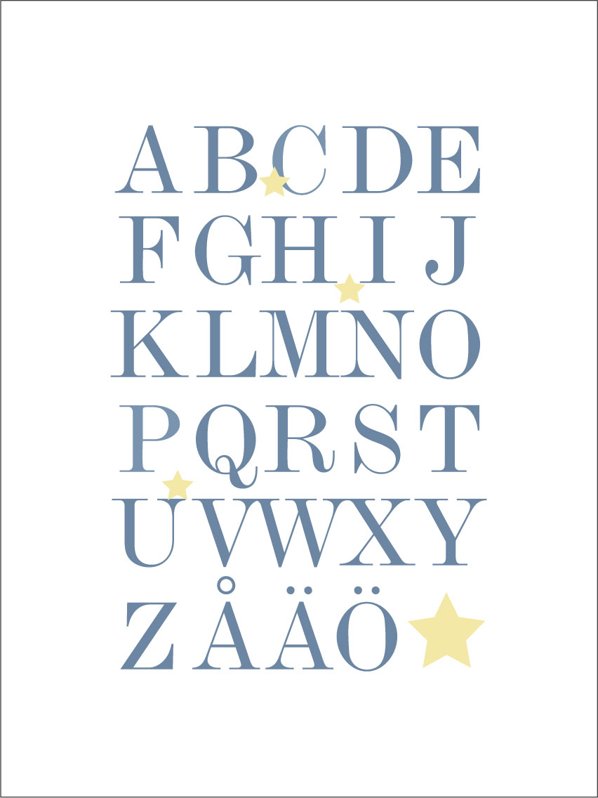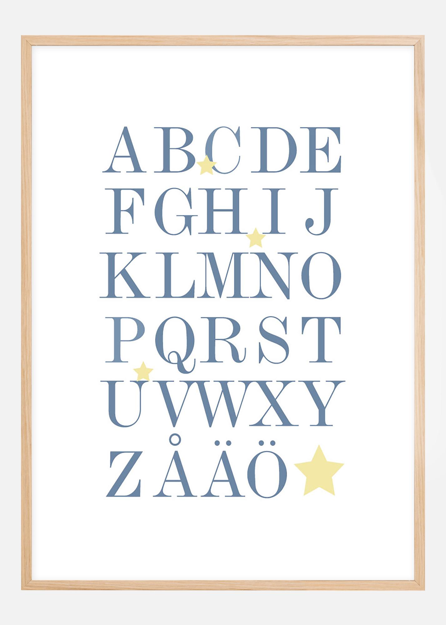Αφίσα με ολόκληρο το αλφάβητο, Α-Ω, σε μπλε και αστέρια σε μπεζ. Το παιδαγωγικό μοτίβο ταιριάζει καλά στο παιδικό δωμάτιο για την εξάσκηση του αλφαβήτου, αλλά και σε άλλους τοίχους στο σπίτι. Η κομψή έκφραση κάνει την αφίσα να ταιριάζει σε όλα τα στυλ διακόσμησης και τύπους σπιτιών. Συνδυάστε ευχαρίστως με άλλα κάδρα για έναν τοίχο με ένα θέμα ή διακοσμήστε τον τοίχο μαζί με την αφίσα με τους αριθμούς 1-10.