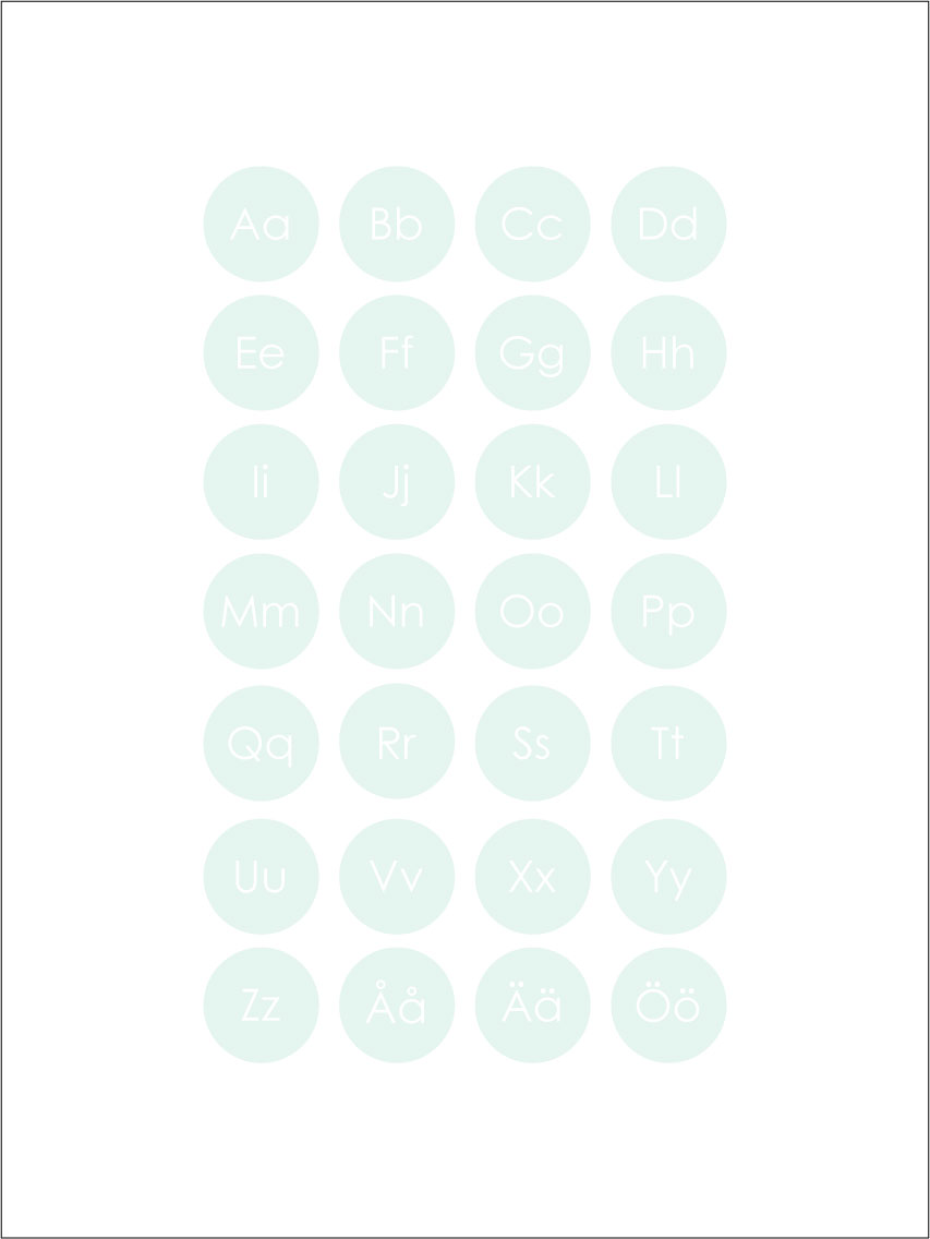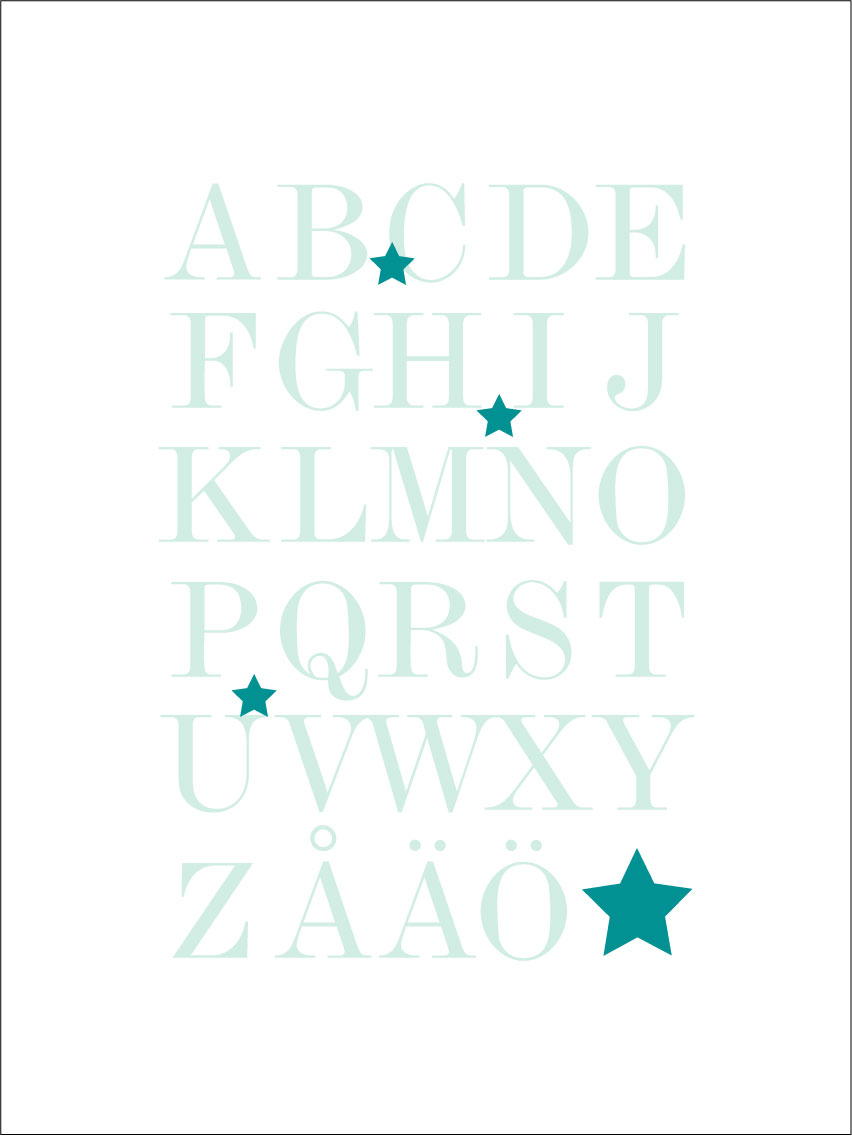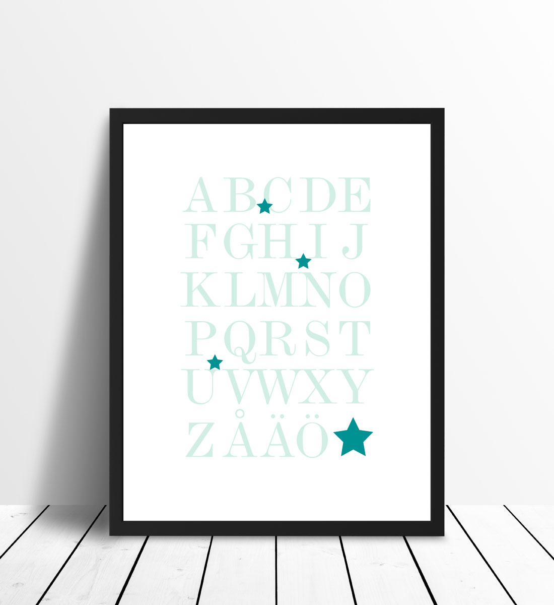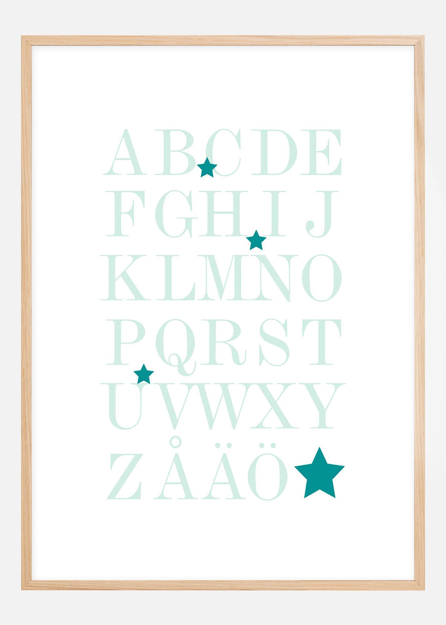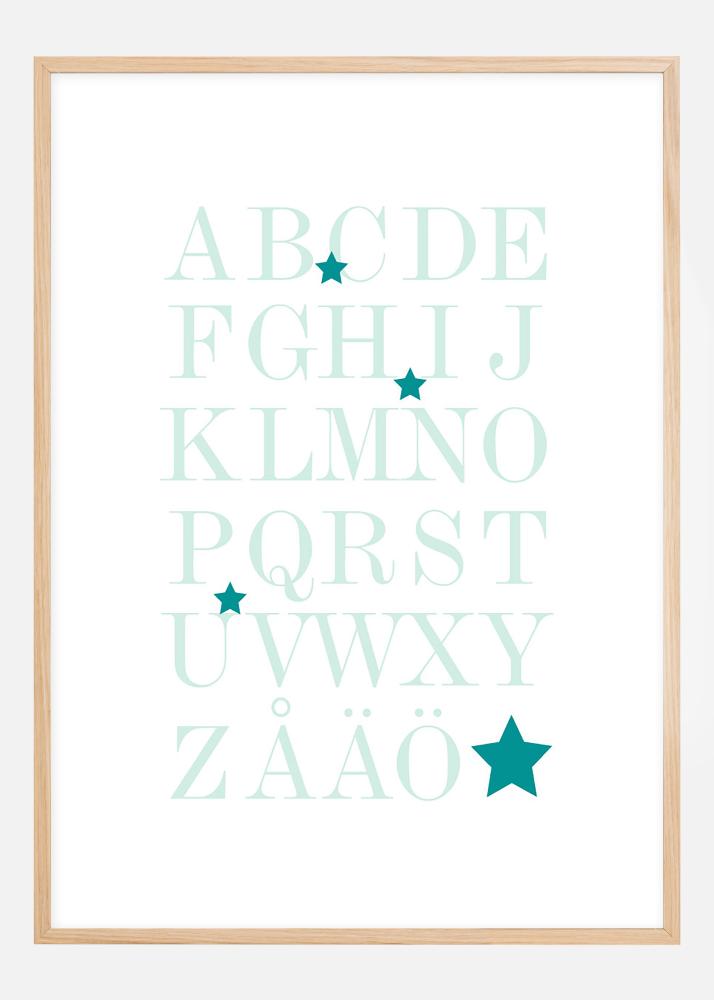 Γραφική εκτύπωση με ολόκληρο το αλφάβητο, Α-Ω, σε αποχρώσεις του πράσινου-τυρκουάζ της θάλασσας. Το εκπαιδευτικό μοτίβο ταιριάζει καλά στο παιδικό δωμάτιο για να εξασκηθείτε με το αλφάβητο, αλλά και σε άλλους τοίχους του σπιτιού. Η κομψή έκφραση κάνει την αφίσα να ταιριάζει σε όλες τις διακοσμητικές στυλ και τύπους σπιτιών. Συνδυάστε την ευχαρίστως με άλλους πίνακες για έναν τοίχο με θέμα ή διακοσμήστε τον τοίχο μαζί με την αφίσα με τους αριθμούς 1-10.