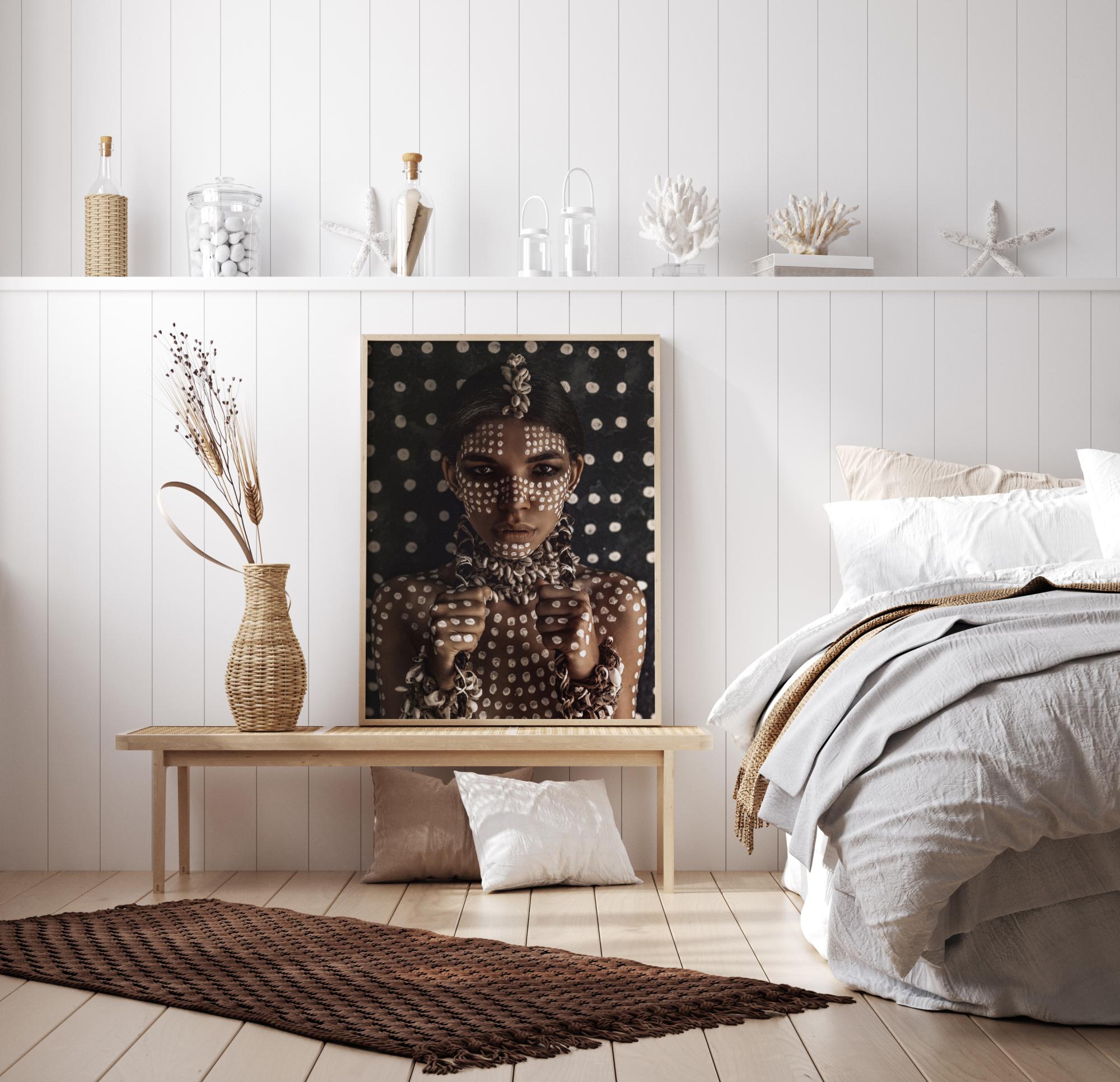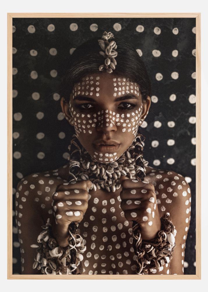 Εδώ σας συναντά ένα σταθερό βλέμμα από μια νεαρή γυναίκα Αβορίγινα με λευκή βαφή σώματος και όμορφα κοσμήματα από φυσικό σχοινί και κοχύλια. Μια γήινη αφίσα φωτογραφίας τέχνης που φαίνεται εξίσου καλή σε μοναχικό μεγαλείο όσο και στον σύγχρονο τοίχο τέχνης.
