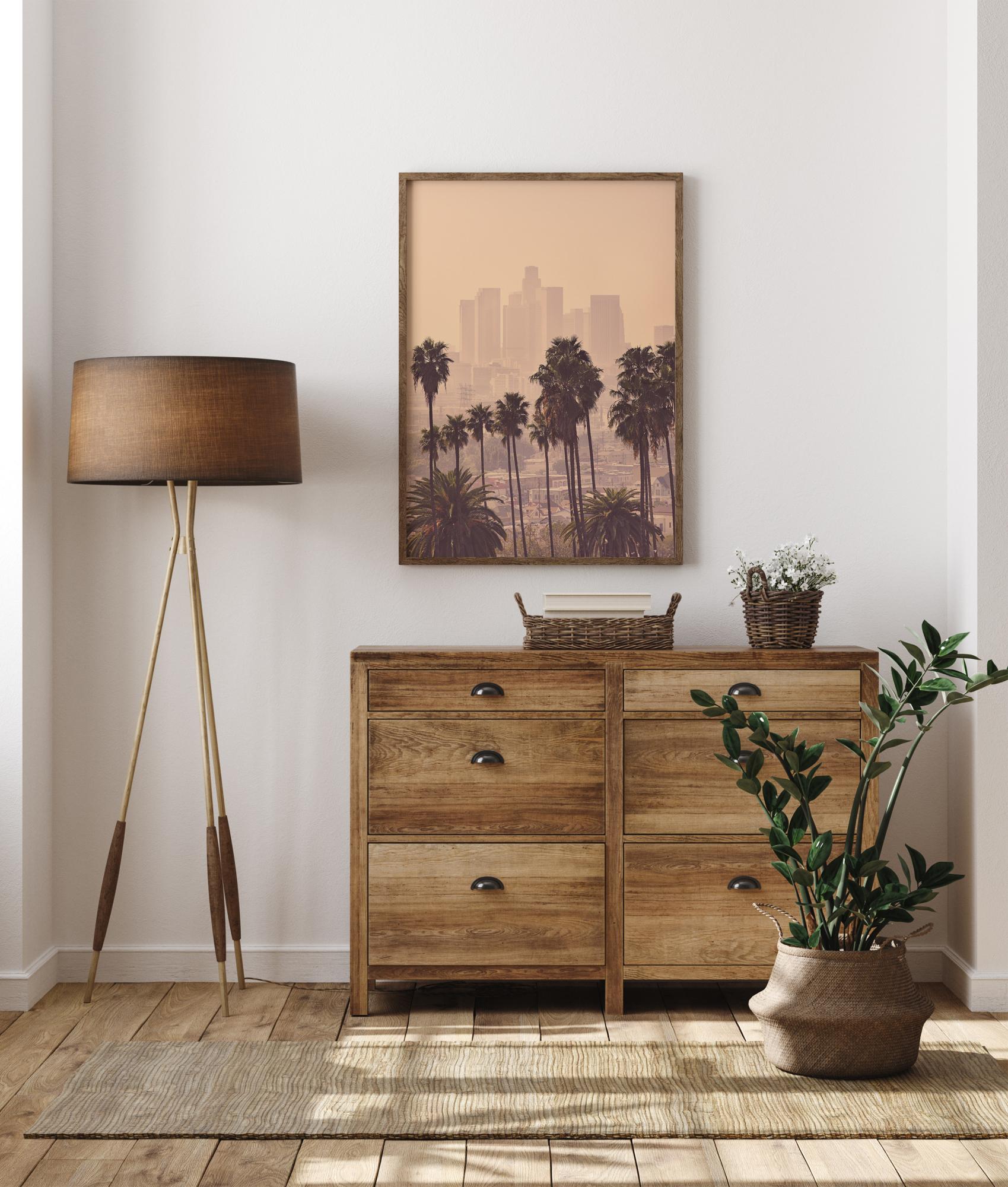 Μια αφίσα με αστικό τοπίο με φοίνικες αλεπούς στο προσκήνιο και τη σιλουέτα μιας πόλης στο βάθος. Οι φοίνικες είναι σε έντονη εστίαση και οι ομιχλώδεις ουρανοξύστες στο βάθος επικεντρώνουν την προσοχή στη φύση. Μπορείτε να νιώσετε την αύρα της ζωής της πόλης σε αυτό το εκφραστικό έργο σε τόνους σέπιας.