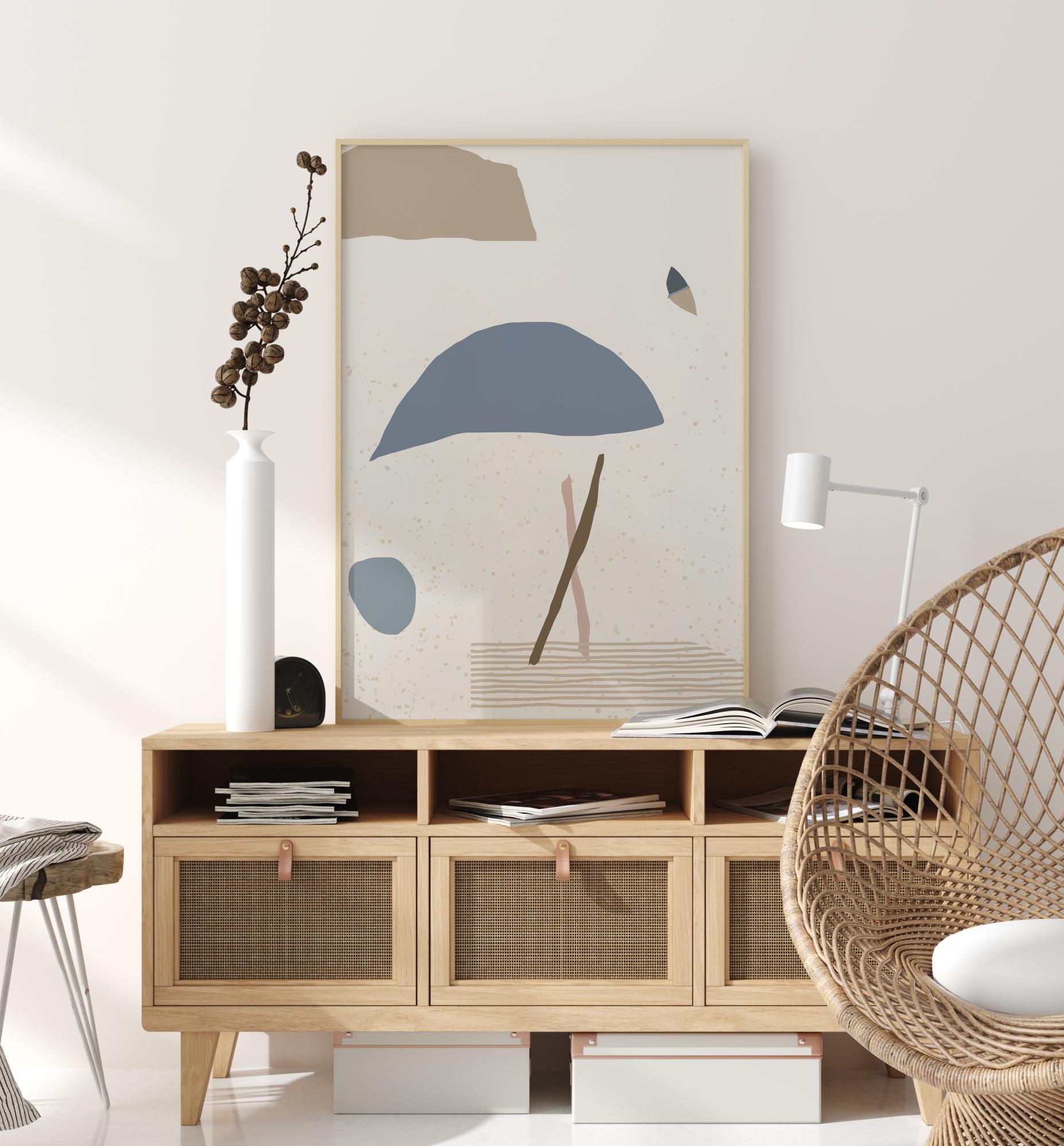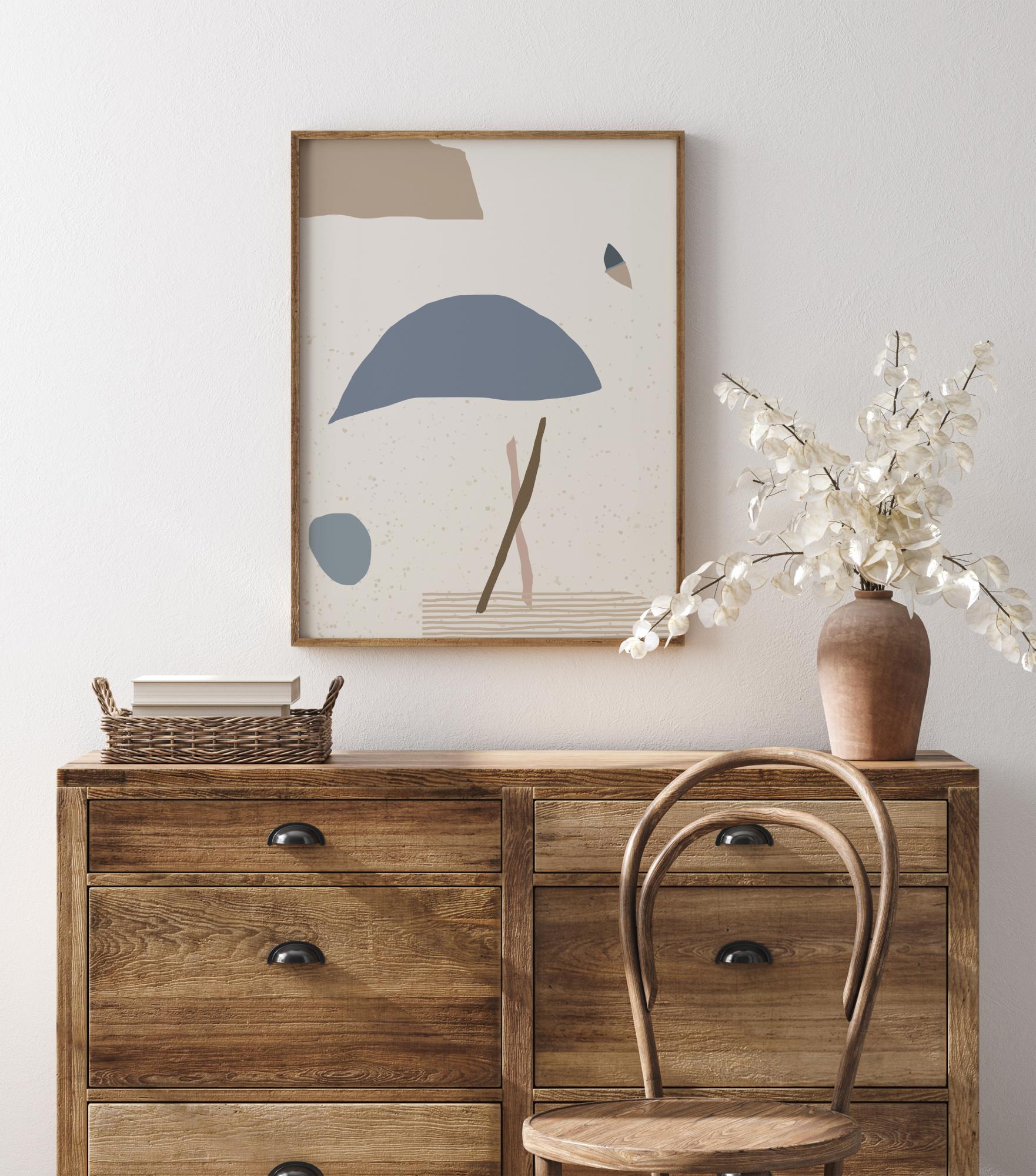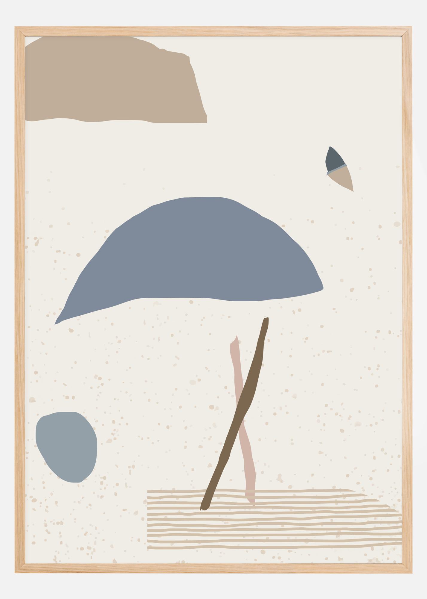 Μια αφηρημένη αφίσα με μπλε, καφέ και γκρι σχήματα σε λευκό φόντο. Δείτε ό,τι θέλετε να δείτε σε αυτό το μινιμαλιστικό έργο που δίνει την αίσθηση ενός ατόμου, μιας ομπρέλας, μιας μπάλας, μιας πεταλούδας ή ενός σύννεφου. Φέρτε την γκαλερί στο σπίτι σας με αυτή την ενδοσκοπική αφίσα και ενθαρρύνετε τη συζήτηση για το νόημά της.