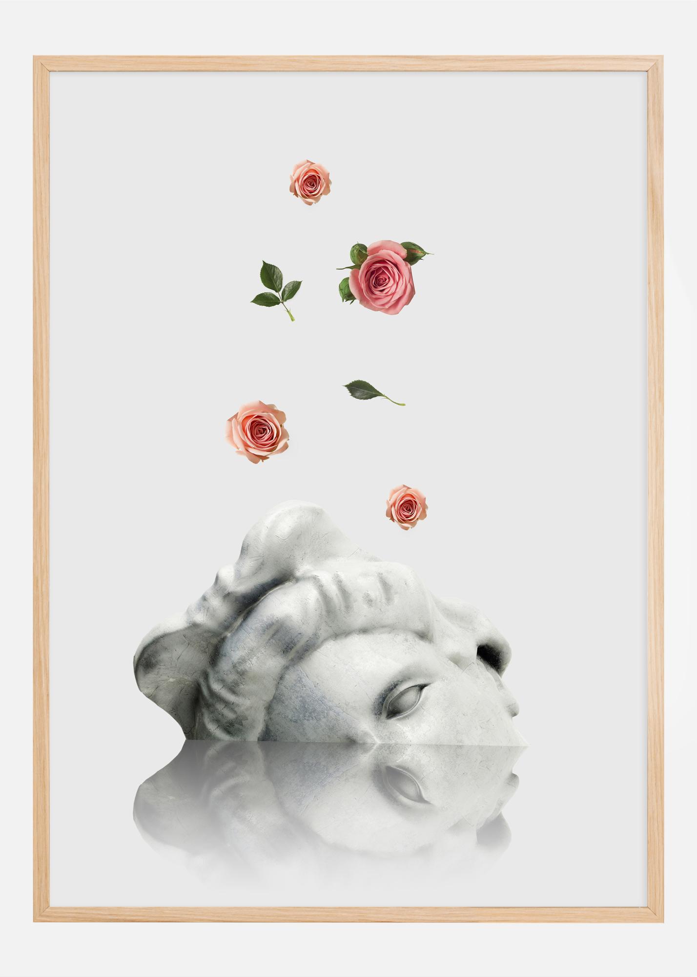 Αυτή η καλλιτεχνική αφίσα παρουσιάζει μια ονειρική σύνθεση όπου ένα γλυπτό ενός προσώπου, που φαίνεται να βυθίζεται ή να διαλύεται, περιβάλλεται από στρόβιλους τριαντάφυλλων σε διάφορα στάδια άνθισης και φυλλωμάτων. Είναι μια συναρπαστική εικόνα που ενώνει την ομορφιά της πέτρας και της χλωρίδας, προσφέροντας μια αίσθηση διαχρονικότητας και φθαρτότητας.