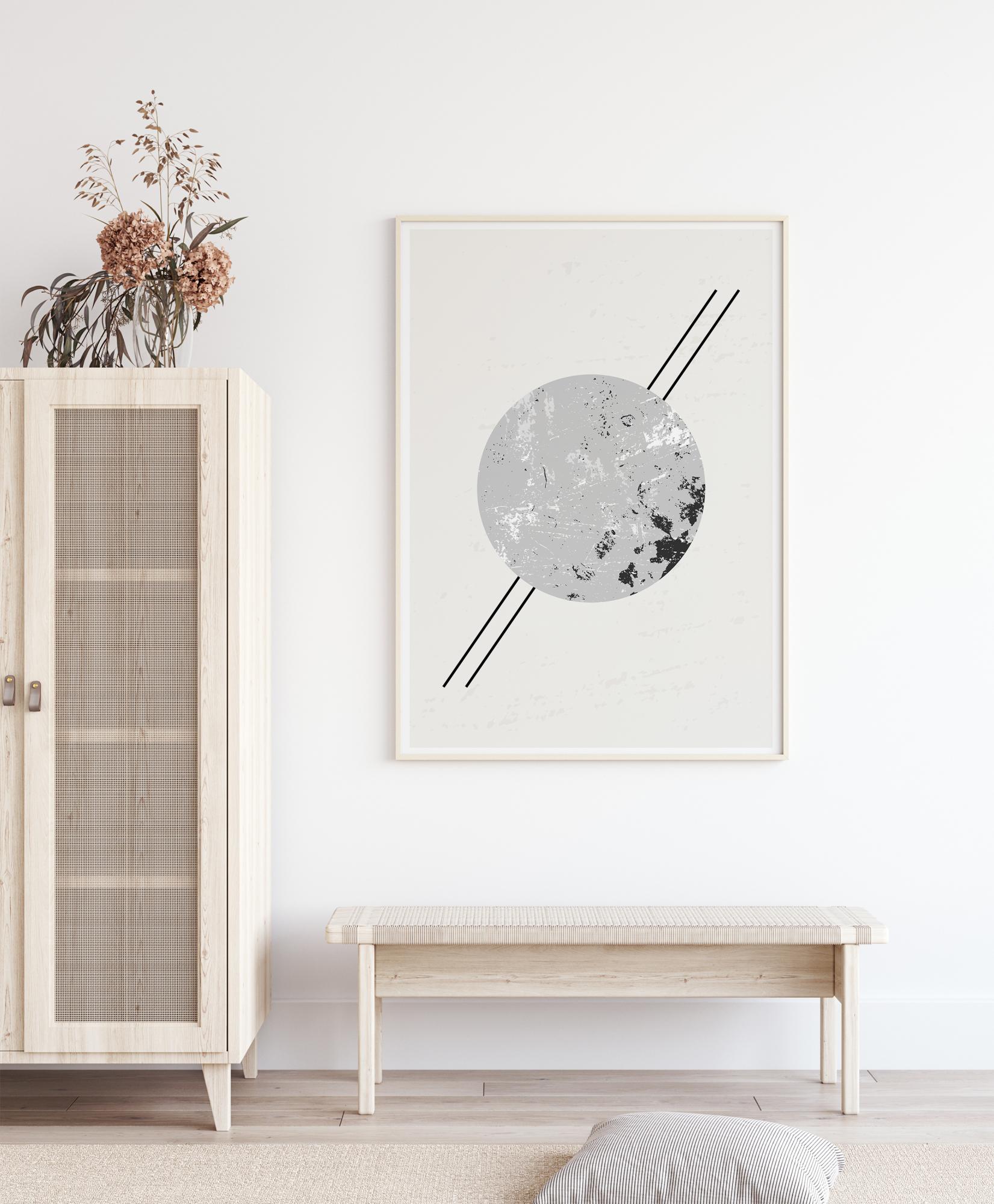 Μια αφηρημένη αφίσα με έναν κύκλο με δύο ευθείες γραμμές που διατρέχουν αυτόν. Οι απαλές γκρι αποχρώσεις του κύκλου αντιπαραβάλλονται με μια σκούρο γκρι και λευκή επίδραση μαρμάρου, που σχεδόν μοιάζει με τη γη από το διάστημα. Γίνετε στοχαστικοί όταν αυτό κρεμιέται σε έναν τοίχο με απαλές παστέλ αποχρώσεις.