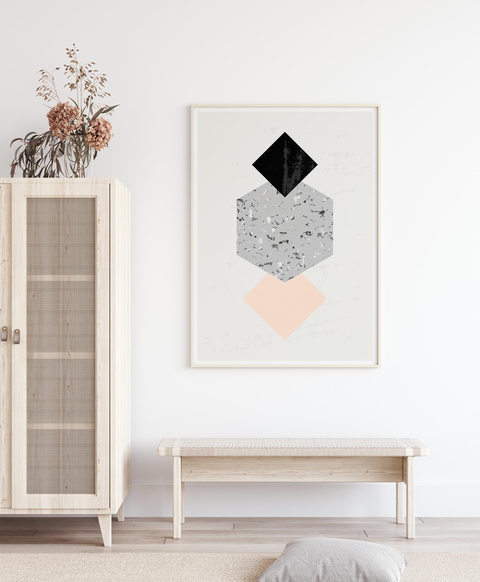 Μια αφηρημένη γεωμετρική αφίσα με δύο διαφορετικά τετράγωνα. Αν και είναι δισδιάστατες, οι γωνίες των τετραγώνων δίνουν την ψευδαίσθηση κύβων. Αυτοί οι κύβοι είναι γεμάτοι με διασκεδαστικές πέτρες και χρωματιστές κουκκίδες σε μπλε, γκρι και μαύρο. Δημιουργήστε έναν εντυπωσιακό τοίχο όταν συνδυάζετε αυτό το απλό κομμάτι με έναν τοίχο με τολμηρά χρώματα.
