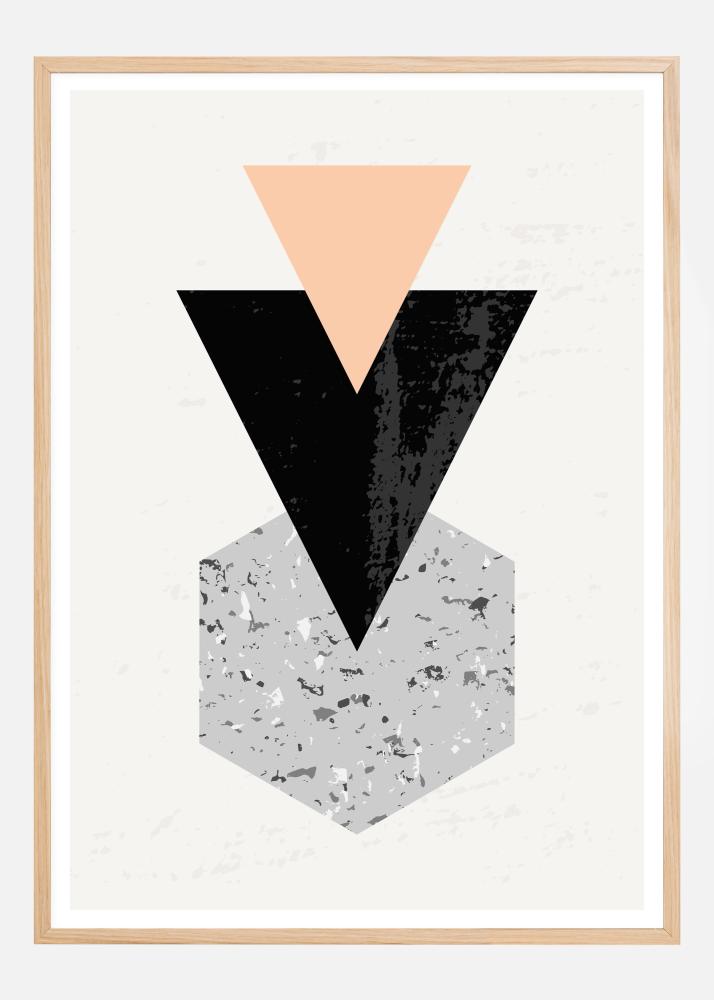 Μια τριγωνική γεωμετρική αφίσα με φωτεινά, τολμηρά σχήματα. Τα δύο τρίγωνα σε ροζ και μαύρο χρώμα δείχνουν προς τα κάτω, καθοδηγώντας το μάτι προς τον απαλότερο μπλε και γραμμωτό κύβο. Το κεντρικά τοποθετημένο μαύρο τρίγωνο κρατάει την προσοχή, καθιστώντας το ιδανικό για παρουσίαση στο σπίτι-γραφείο, με τον λιγότερο αποσπασματικό του σχεδιασμό που είναι συμβατός με όλους τους χώρους.