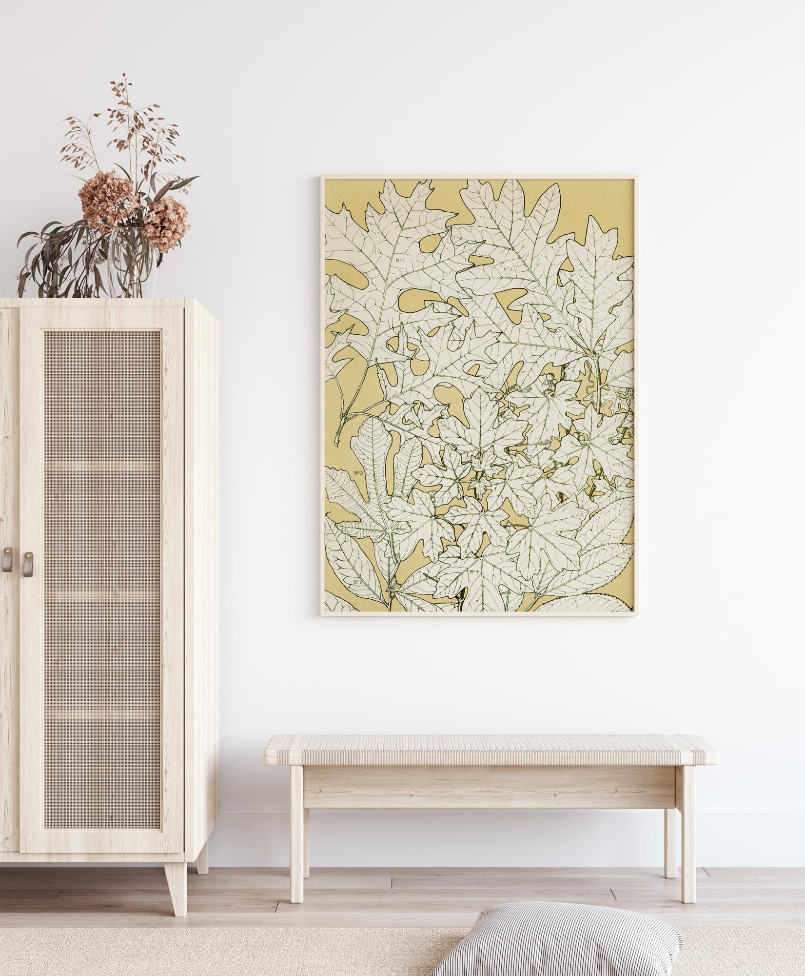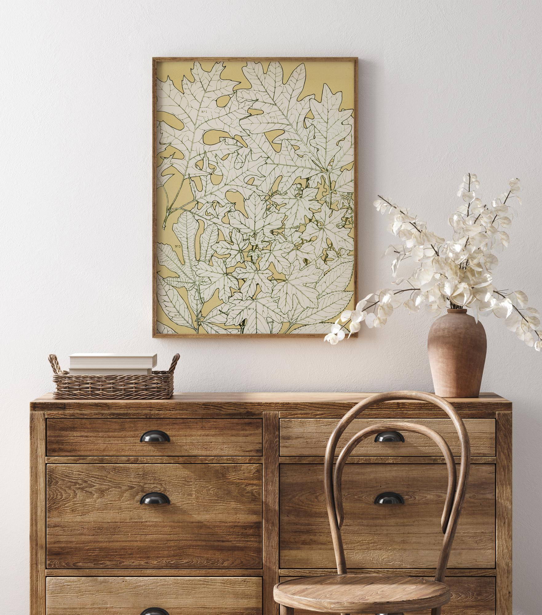 Μια αφηρημένη αφίσα με φύλλα με απλά σχεδιασμένα φύλλα σε ένα απαλό χρυσό φόντο. Διάφορα φύλλα είναι επιμελώς σχεδιασμένα με τις φλέβες και τα στελέχη τους. Η απουσία χρώματος τα κάνει να ξεχωρίζουν μπροστά από το συμπαγές φόντο, αναδεικνύοντας όλες τις λεπτομέρειες. Κρεμάστε αυτή την αφίσα σε έναν απλό τοίχο για να προσφέρετε μια φυσική αίσθηση στο σπίτι σας.