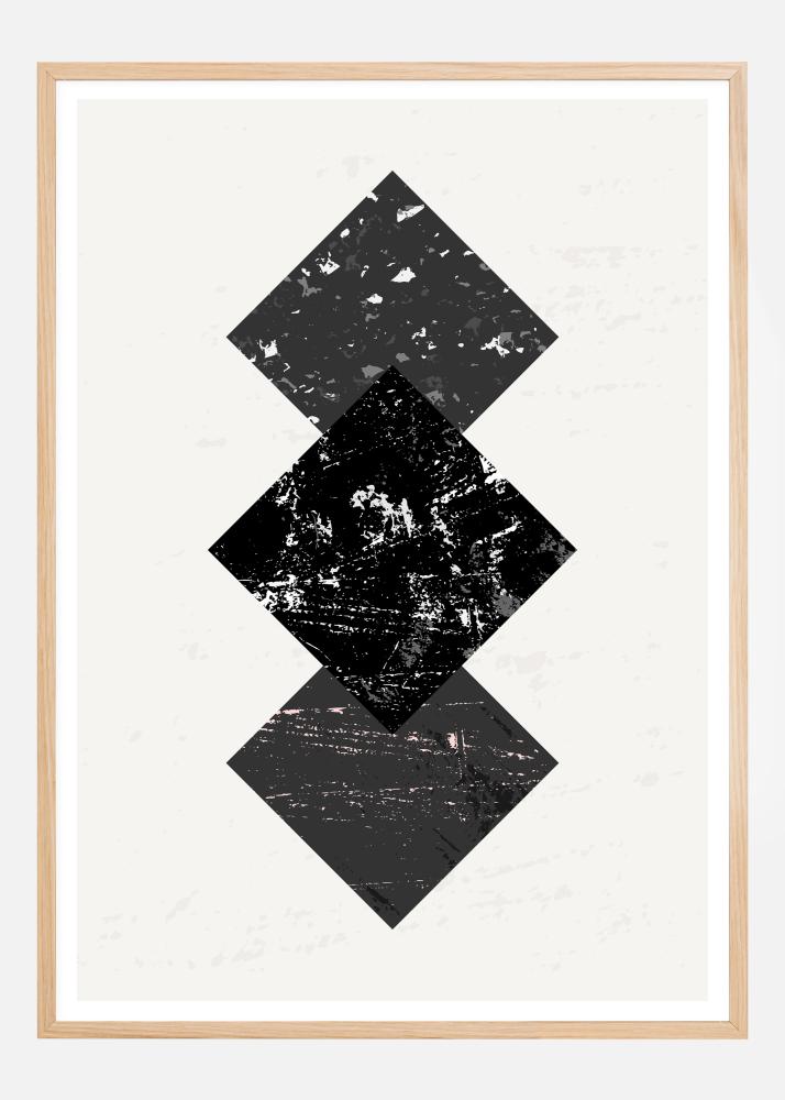 Μια γεωμετρική αφίσα με τρία σκούρα τετράγωνα που στηρίζονται στις γωνίες τους. Δύο σκούρα μπλε τετράγωνα τοποθετούνται πάνω και κάτω από ένα μεγαλύτερο μαύρο τετράγωνο. Όλα είναι επισημασμένα με λευκές κουκκίδες και στίγματα επάνω τους για να δημιουργήσουν ένα ενδιαφέρον σύνολο σχεδίων. Συνδυάστε αυτό το έργο τέχνης με έναν μπλε τοίχο και αφήστε τα σχήματα να ξεχωρίσουν.