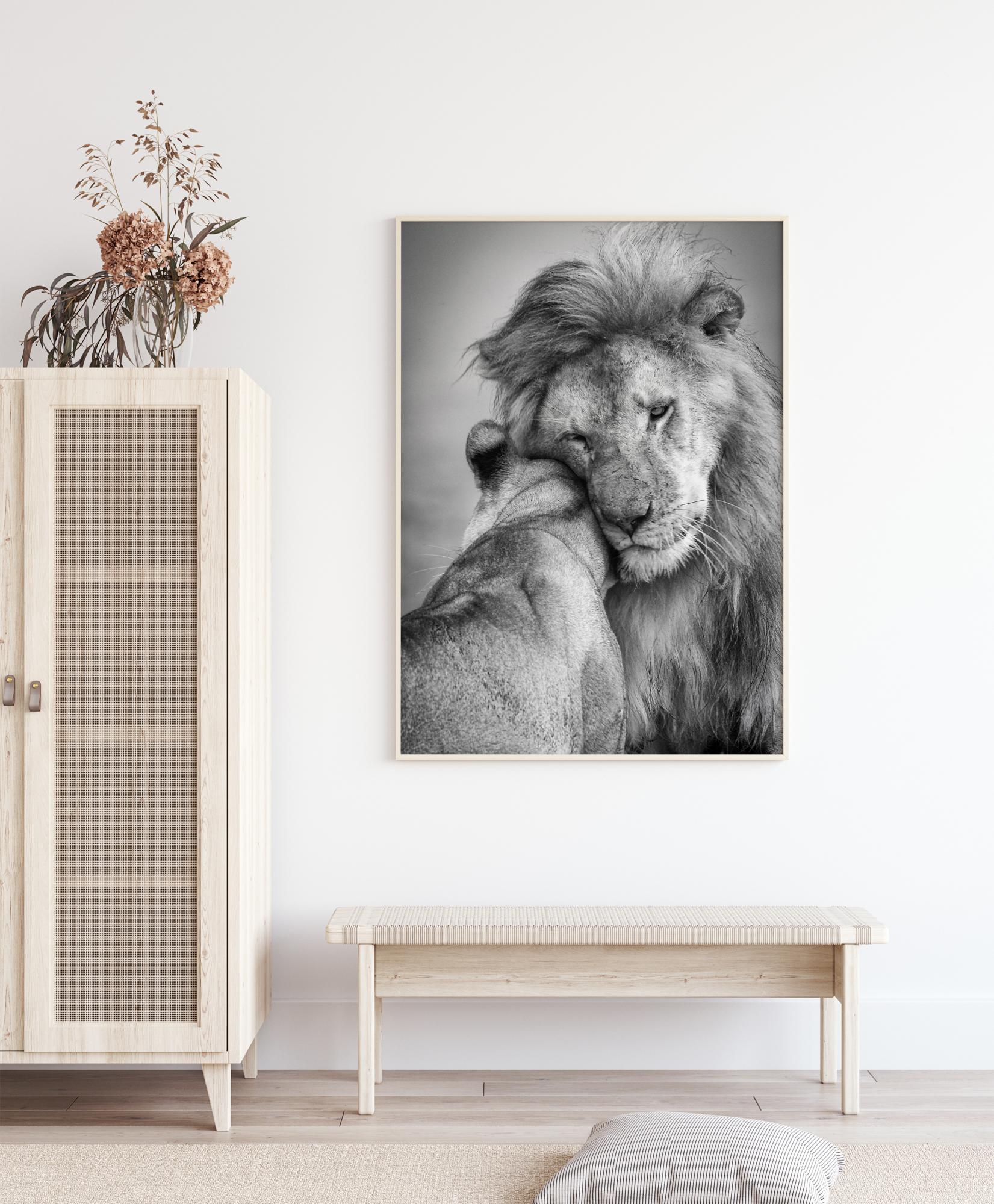 Μια αφίσα με θέμα τη φύση με ένα λιοντάρι και μια λέαινα σε μια τρυφερή στιγμή. Σε αυτήν την εκπληκτική ασπρόμαυρη εικόνα, βλέπετε το αρσενικό λιοντάρι να αγκαλιάζει τη λέαινά του καθώς εκείνη ξαπλώνει με την πλάτη της προς αυτόν. Ζήστε την αγάπη σε αυτήν τη ζεστή αγκαλιά κάθε πρωί που ξυπνάτε.