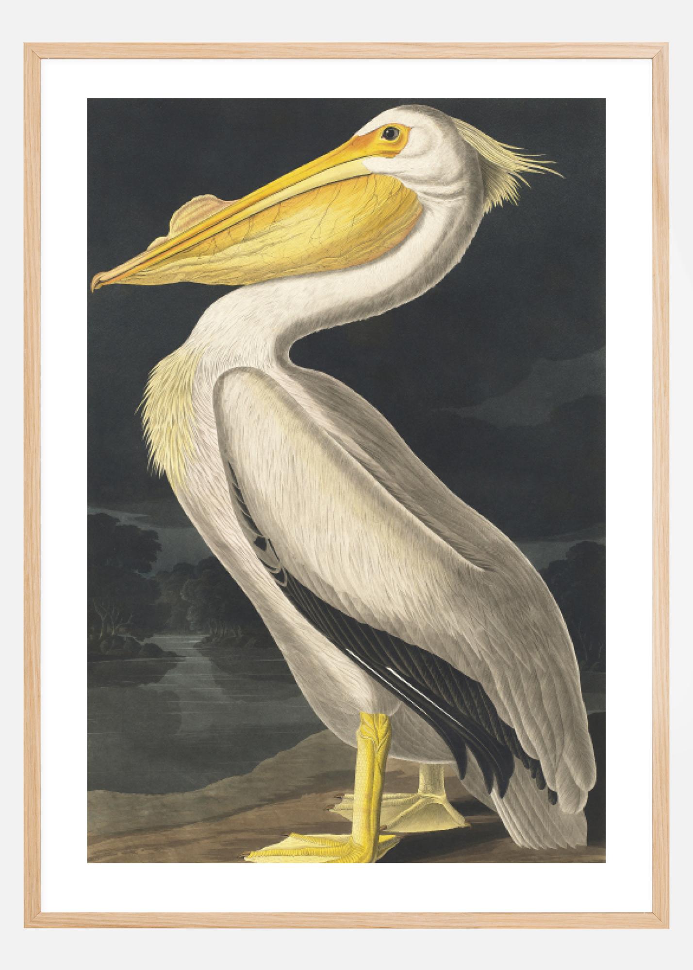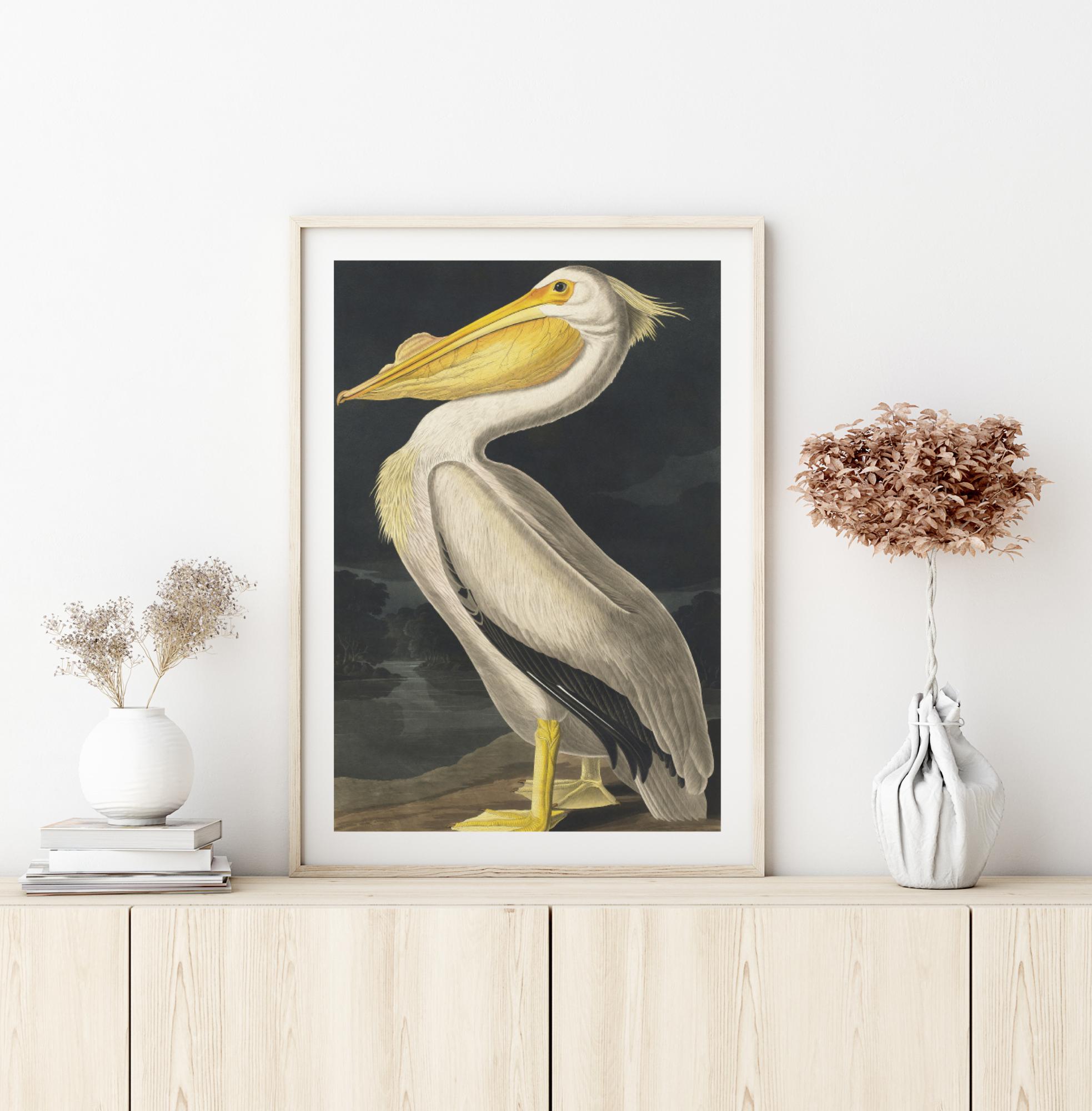 Μια αφίσα φυσικής τέχνης με μια ζωγραφισμένη πελεκάνο. Εδώ το πουλί κάθεται ψηλά και περήφανα με το στιβαρό κίτρινο ράμφος του μπροστά στο στήθος του. Τα έντονα κίτρινα πόδια και το λευκό στήθος του δημιουργούν έντονη αντίθεση με το σκοτεινό, ήπιο τοπίο πίσω του. Φέρτε μαζί σας μια αίσθηση αρχαίων ζωγραφιών αγοράζοντας αυτήν την καταπληκτική εικόνα.
