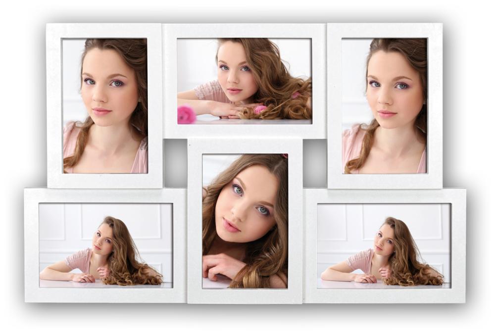 Μοντέρνα λευκή κορνίζα κολάζ με χώρο για 6 εικόνες τόσο σε οριζόντια όσο και σε κατακόρυφη μορφή. Ιδανική όταν θέλετε να δημιουργήσετε ένα προσωπικό κολάζ φωτογραφιών για να κρεμάσετε στον τοίχο.