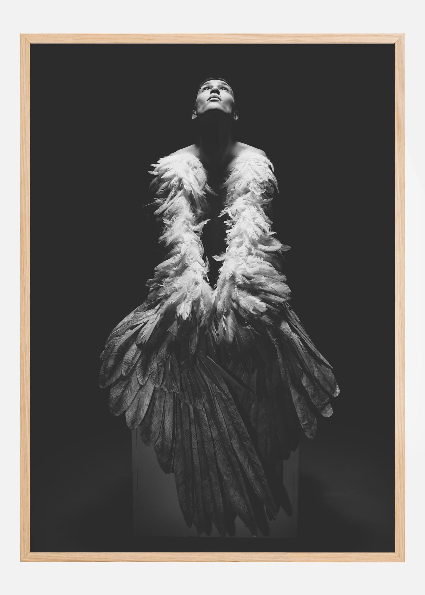 Μια αφίσα πορτραίτου ενός άνδρα με μακριά φτερωτή φορεσιά για να μοιάζει με πτήση στον αέρα. Στέκεται μπροστά από ένα μαύρο φόντο και κοιτάζει προς τον ουρανό. Ένας προβολέας φωτίζει από πάνω, αναδεικνύοντας το πρόσωπό του και τους ώμους του, ώστε να εστιάζετε αυτόματα σε αυτόν όταν κοιτάζετε αυτό το δραματικό έργο.