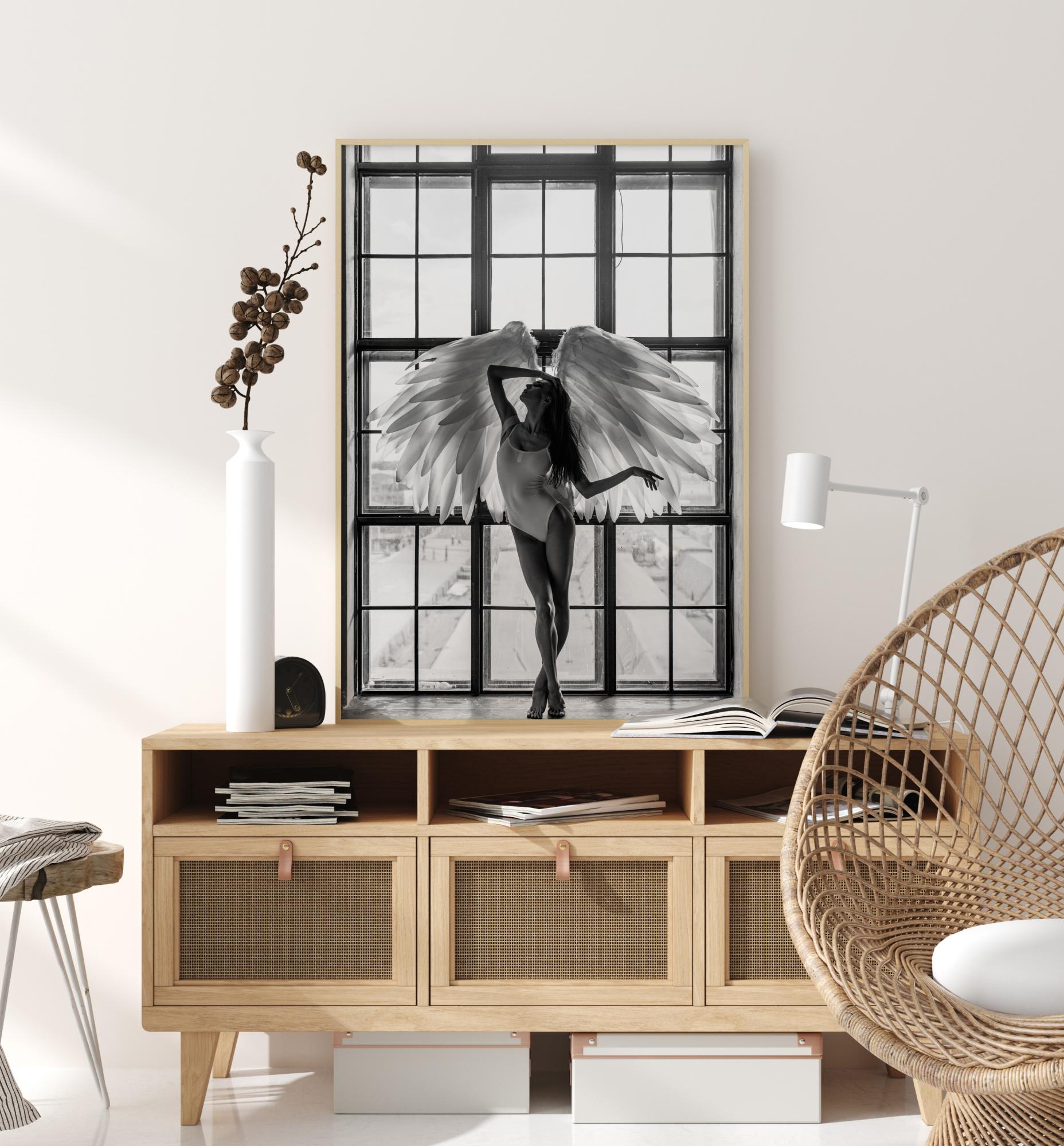 Μια όμορφη αφίσα φωτογραφικής τέχνης σε σκούρα γκρίζα απόχρωση με μια γυναίκα που ποζάρει σε ένα μεγάλο παράθυρο φορώντας κορμάκι και μεγάλες όμορφες φτερούγες αγγέλου. Μια αφίσα που είναι εύκολο να συνδυαστεί με άλλα αγαπημένα, αλλά ταιριάζει εξίσου καλά ως μοναδικό σημείο εστίασης.