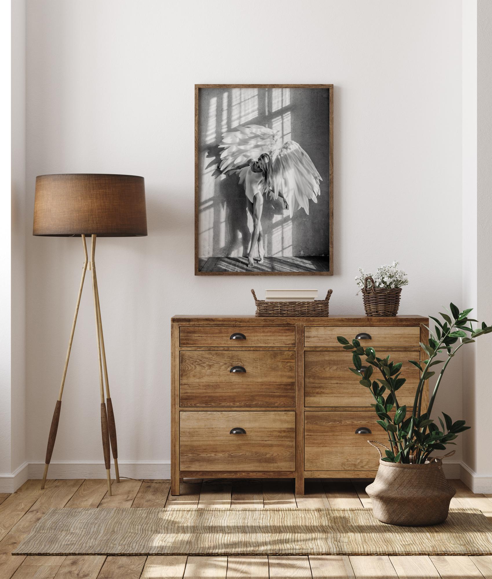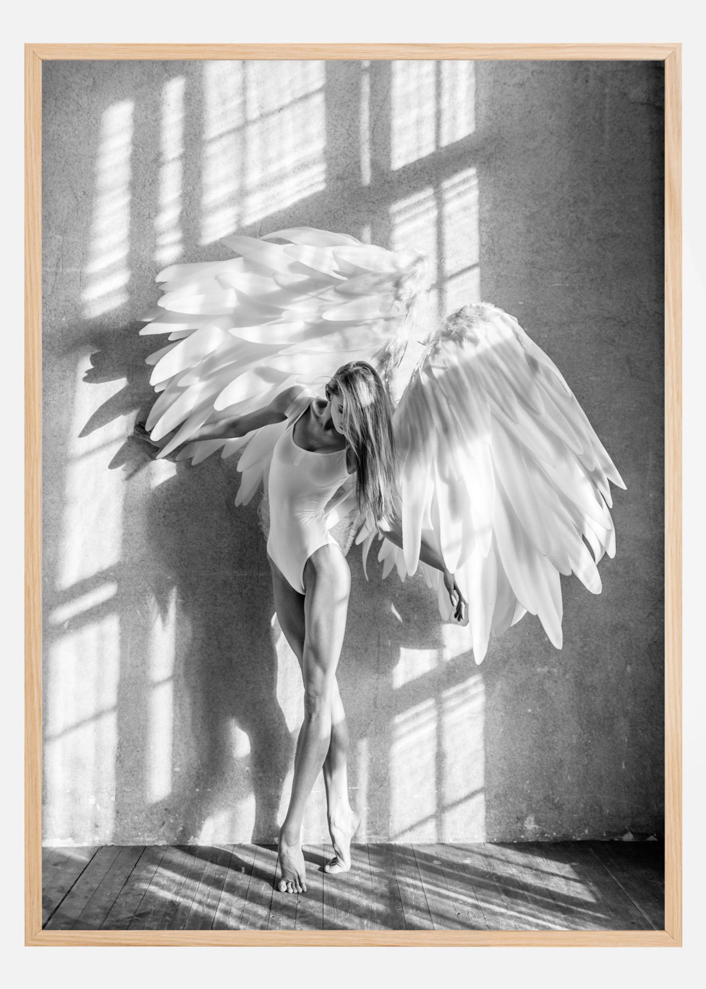 Μια υπέροχη αφίσα φωτογραφικής τέχνης σε απαλές αποχρώσεις του γκρι που απεικονίζει μια γυναίκα να ποζάρει σαν μπαλαρίνα με ένα ζευγάρι μεγάλες φτερούγες αγγέλου στο φως ενός γιγαντιαίου παραθύρου του οποίου οι σκιές παίζουν πάνω στην εικόνα. Αυτή είναι μια αφίσα για εκείνον που επιθυμεί μια απαλή και όμορφη πινελιά στο σπίτι του.