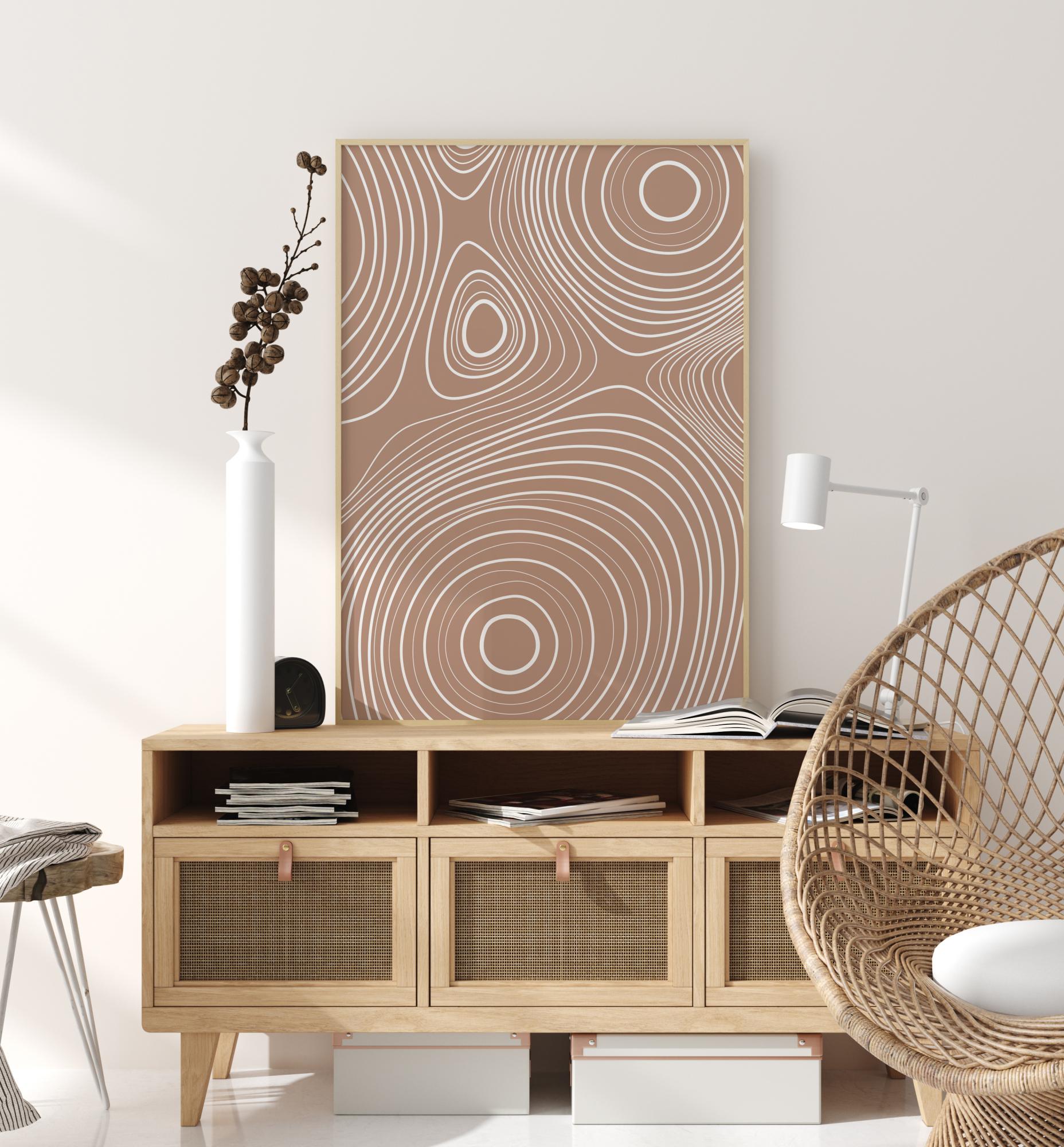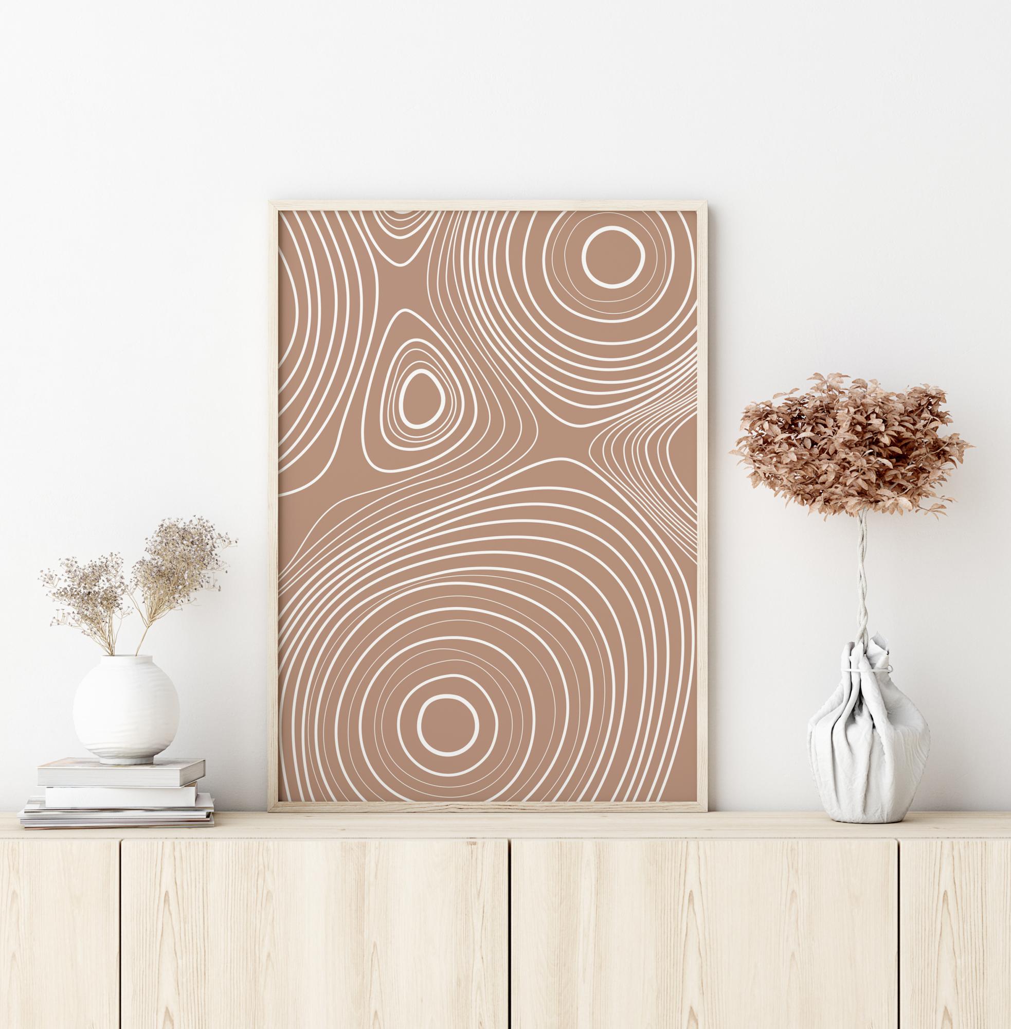Μια στροβιλισμένη αφηρημένη αφίσα με λευκές γραμμές σε ανοιχτό καφέ φόντο. Κοιτάξτε αυτούς τους λευκούς κύκλους καθώς εκτείνονται προς τα έξω σε αυτή την καταπληκτική εικόνα. Αφεθείτε να χαθείτε σε αυτές τις χαλαρωτικές σπείρες καθώς κρεμάτε αυτήν την ειρηνική αφίσα στο σπίτι σας, προσφέροντας τέλεια χαλάρωση στο μπάνιο ή στο σαλόνι σας.