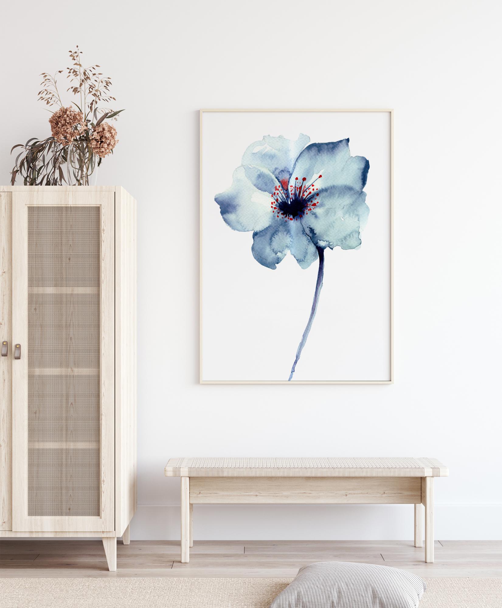 Ένα επιβλητικό λουλούδι ζωγραφισμένο σε μπλε και κόκκινη ακουαρέλα. Μια όμορφη αφίσα με όλη την απλότητά της, που ταιριάζει εξίσου καλά στην κουζίνα ή στο χολ, όσο και στο σαλόνι ή στην κρεβατοκάμαρα.