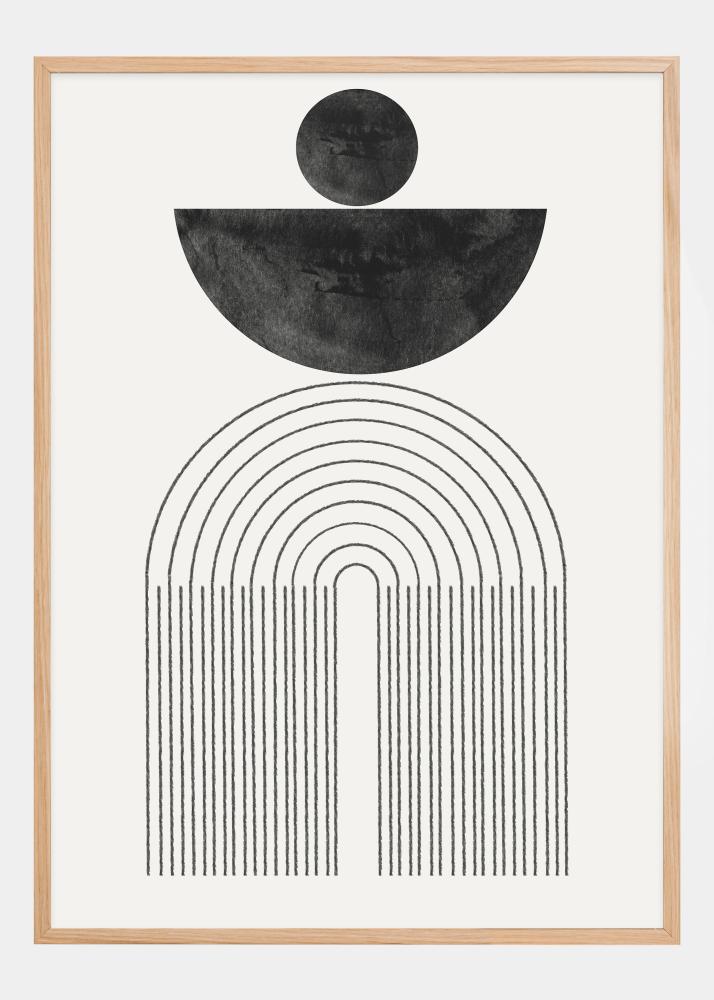 Αυτή η τολμηρή και υποβλητική αφίσα είναι μια κομψή ερμηνεία των κύκλων της Σελήνης και της αρμονίας των ουράνιων σωμάτων. Η μαύρη ημικύκλια και ο πλήρης κύκλος πάνω απεικονίζουν τις διάφορες φάσεις της Σελήνης, ενώ οι στροβιλιστές γραμμές κάτω μοιάζουν με αρχιτεκτονικούς πυλώνες ή πύλες σε μια άλλη διάσταση. Η αντίθεση μαύρου και άσπρου στο έργο τέχνης προσδίδει μια αίσθηση κομψότητας και μυστικισμού που εμπλουτίζει κάθε δωμάτιο.