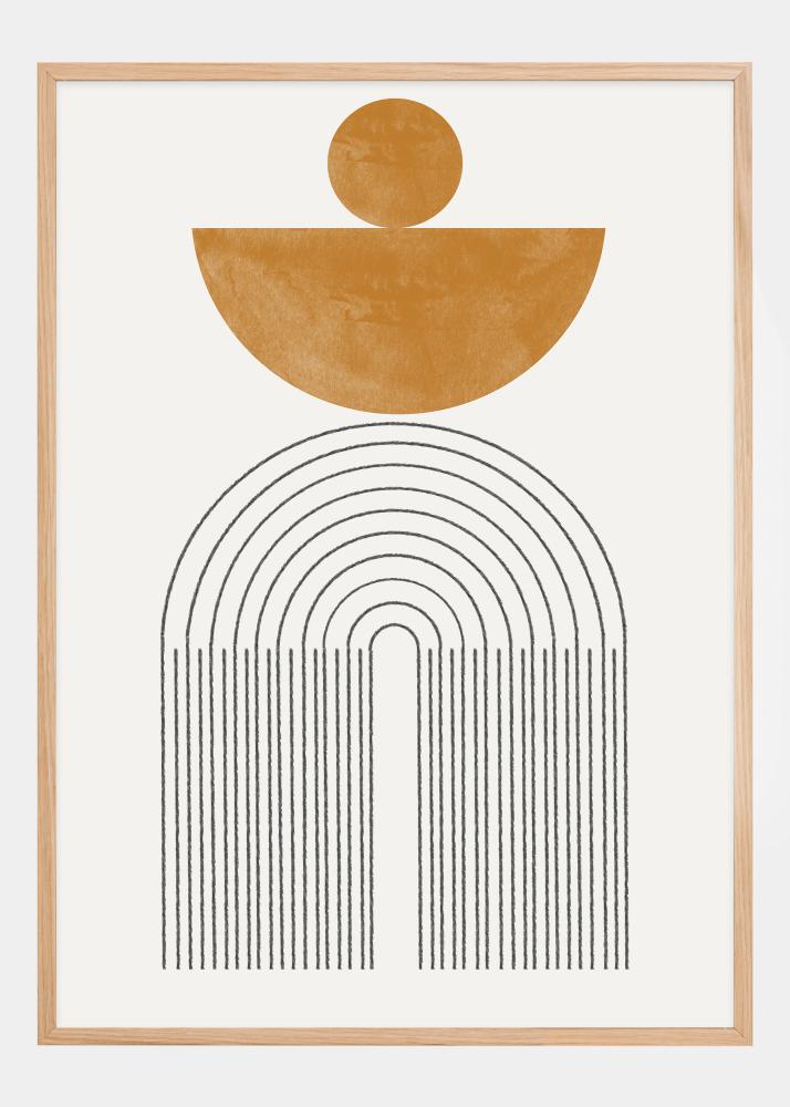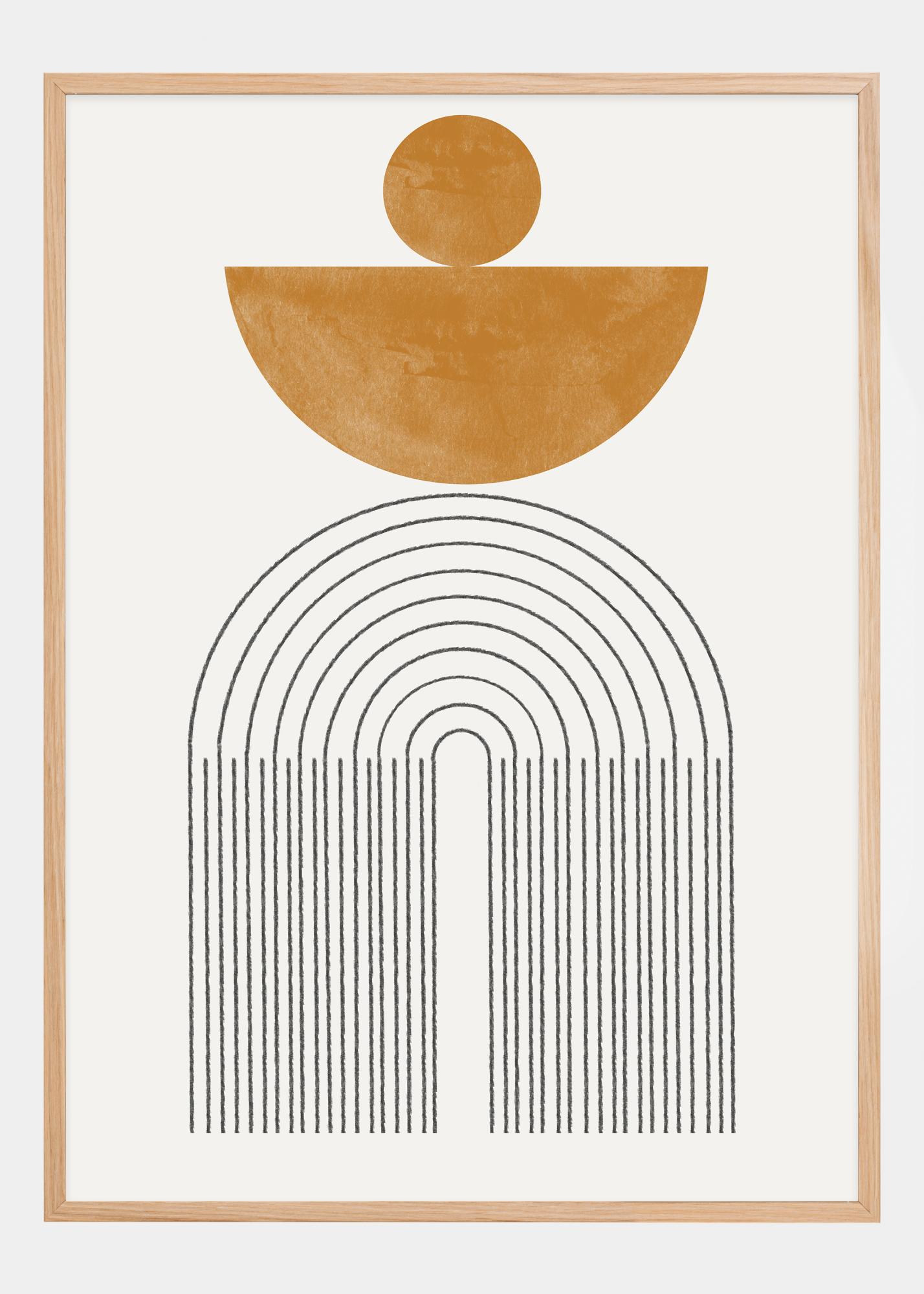 Αυτή η κομψή αφίσα συνδυάζει οργανικές μορφές και καθαρές γραμμές σε μια σύνθεση που είναι τόσο καταπραϋντική όσο και οπτικά ενδιαφέρουσα. Ένα μεγάλο ημικύκλιο στο χρώμα της ώχρας κάθεται σαν ηλιοβασίλεμα πάνω από μια σειρά καμάρες, δημιουργώντας μια αρχιτεκτονική αίσθηση χώρου και βάθους. Στην κορυφή, ο σχεδιασμός ισορροπεί με έναν μικρότερο κύκλο, θυμίζοντας την τροχιά του ήλιου στον ουρανό.