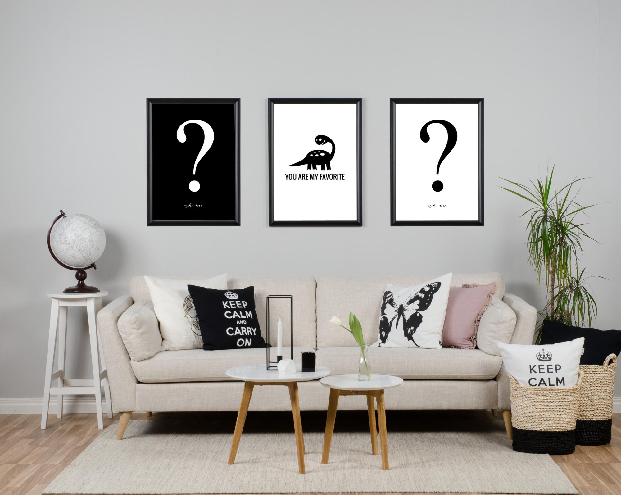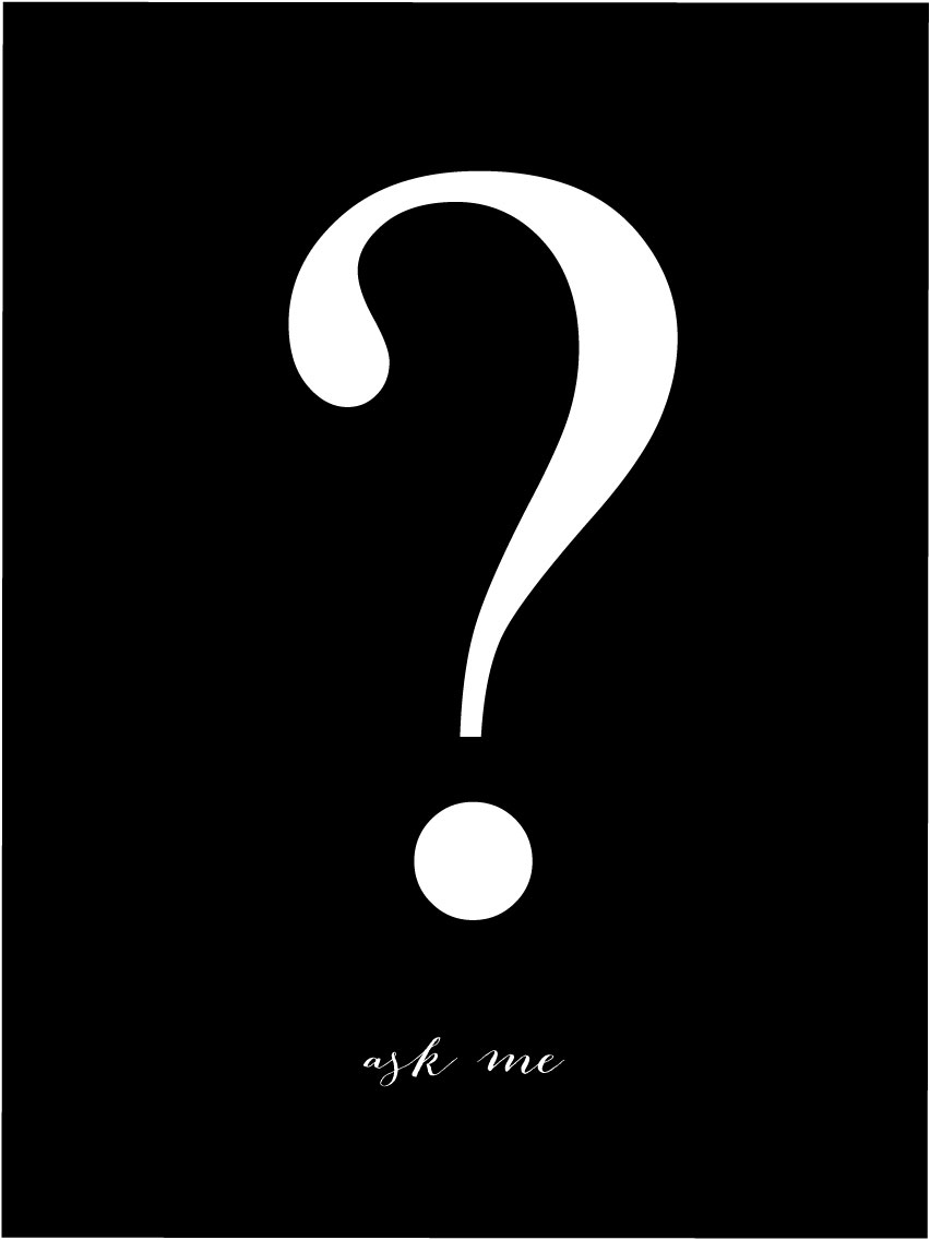Κομψό γραφικό φύλλο, Ρώτησέ με, με κείμενο και ένα μεγαλύτερο ερωτηματικό με λευκή γραμματοσειρά σε μαύρο φόντο. Όμορφο μαζί με άλλα εκτυπωμένα σε έναν τοίχο με πίνακες στο σαλόνι, ή άφησε τους επισκέπτες να ξέρουν ότι είσαι ανοιχτό άτομο ήδη από την είσοδο. Η αφίσα είναι όμορφη μαζί με τα άλλα τυπογραφικά μοτίβα στην ίδια σειρά - Ρώτησέ με, Κάνε μου ή Μοιράσου με.