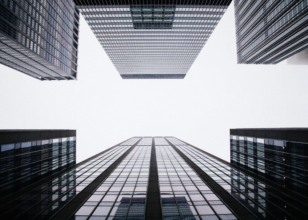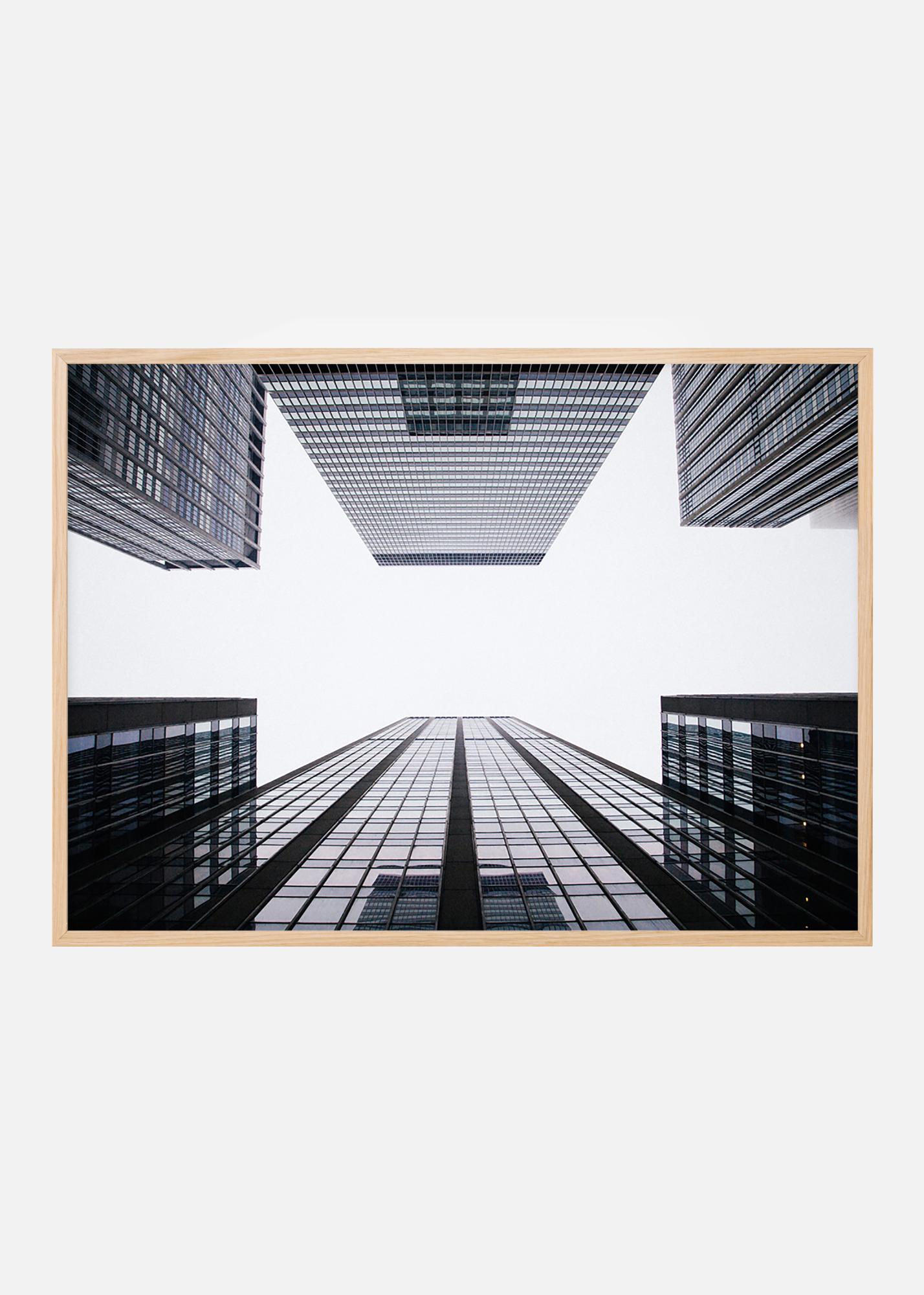 Αφίσα αρχιτεκτονικής με αναπτυσσόμενους ουρανοξύστες κάτω από έναν λευκό σαν σύννεφο ουρανό. Καθαρή εικόνα σκοτεινών κτιρίων με λευκό φόντο, με τις αντανακλάσεις του ουρανού στους υαλοπίνακες. Ιδανικό δώρο για όσους αγαπούν τα γραφικά πορτραίτα κτιρίων. Η εκτύπωση φαίνεται υπέροχη σε μια μαύρη κορνίζα που ενισχύει το σκοτάδι της εικόνας και συνδυάζεται όμορφα με άλλες φωτογραφίες αρχιτεκτονικής.
