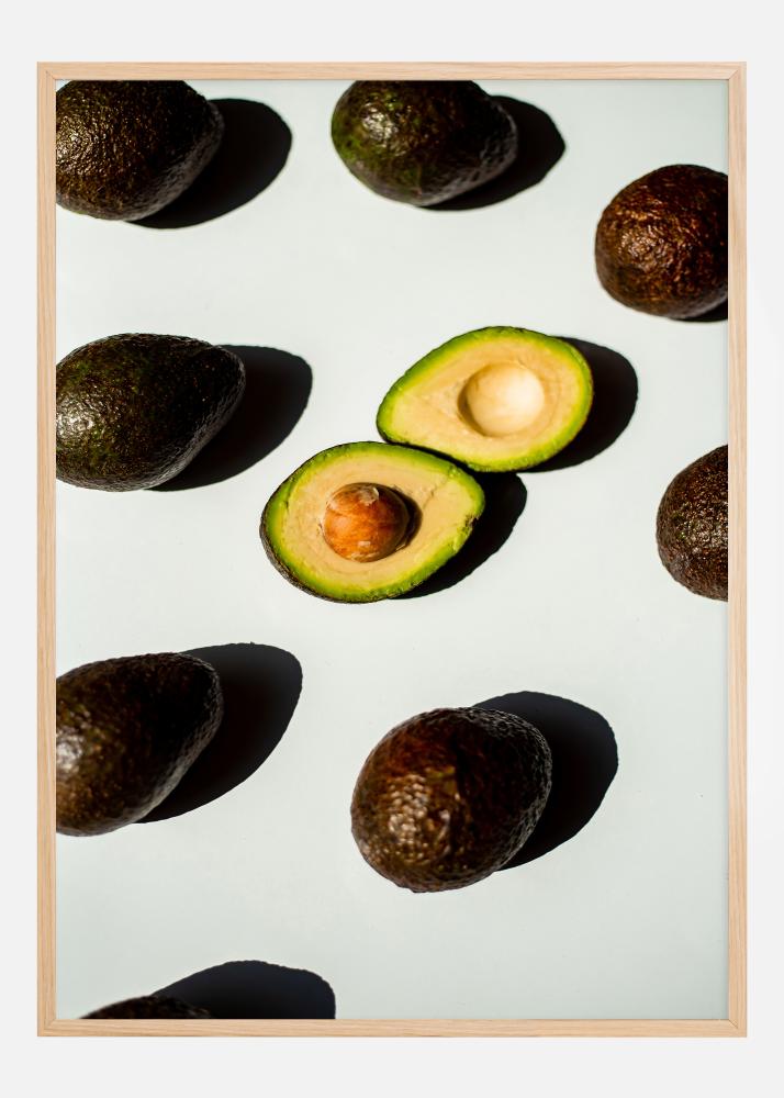 Η αφίσα αυτή αποτίνει φόρο τιμής στην απλή ομορφιά του αβοκάντο, ενός φρούτου που έχει γίνει σύμβολο της υγιεινής διατροφής και των σύγχρονων μαγειρικών τάσεων. Οι σκούρες, πράσινες και τραχιές φλούδες ολόκληρου του αβοκάντο έρχονται σε αντίθεση με το ανοιγμένο μισό που αποκαλύπτει το λείο, ανοιχτό πράσινο εσωτερικό και τον γυαλιστερό, καστανό πυρήνα. Αυτό το παιχνίδι μεταξύ υφής και χρώματος προσδίδει μια ευχάριστη και ταυτόχρονα κομψή αισθητική.