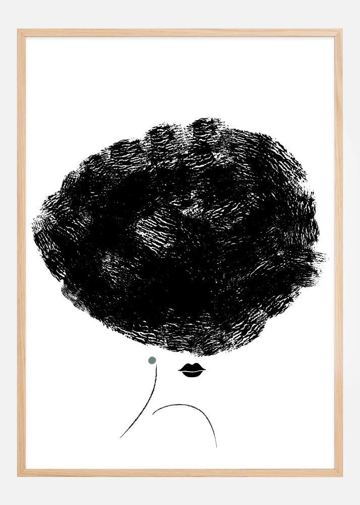 Αυτή η εννοιολογική αφίσα απεικονίζει ένα μινιμαλιστικό αλλά εκφραστικό γυναικείο προφίλ, όπου τα μεγάλα, ογκώδη μαλλιά της κυριαρχούν στη σκηνή. Τα μαλλιά, που απεικονίζονται με δυνατές και παχιές πινελιές σε μαύρο, δημιουργούν μια δραματική αντίθεση με το λευκό φόντο και προσφέρουν την αίσθηση μιας δυναμικής κίνησης που συλλαμβάνεται σε μια ήσυχη στιγμή. Ένα μικρό, διακριτικό πράσινο σημείο, τοποθετημένο στο αυτί, διακόπτει τη μονοχρωμία και προσθέτει μια διακριτική χρωματική έμφαση. Αυτή η εκτύπωση αναδεικνύει το ουσιαστικό στη μορφή και το χρώμα, προσφέροντας μια τολμηρή, σύγχρονη αισθητική σε οποιονδήποτε σύγχρονο χώρο.