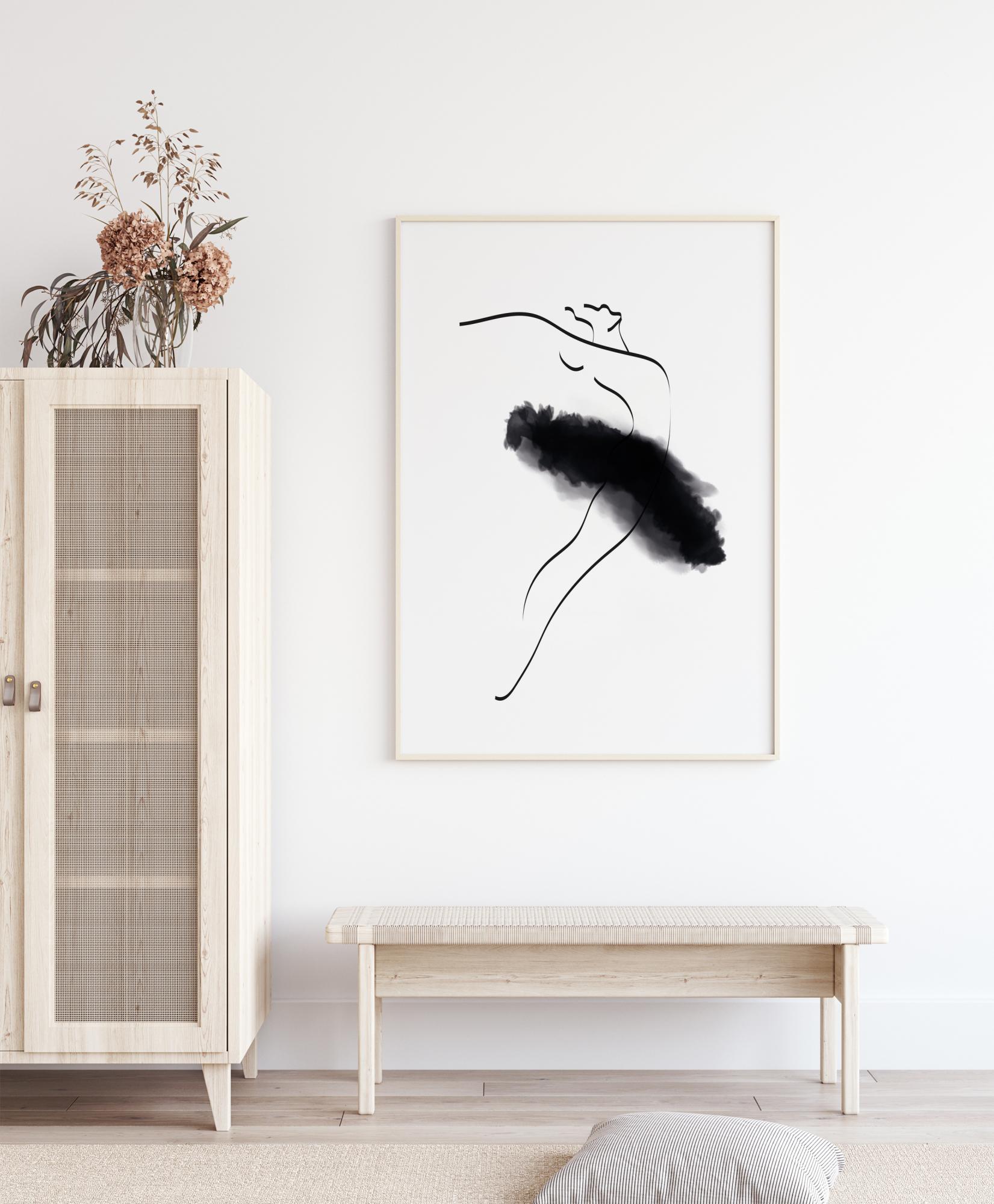 Μια ακουαρέλα μιας μπαλαρίνας σε λεπτές μαύρες γραμμές με μια πιο έντονη μαύρη φούστα μπαλαρίνας. Μια μινιμαλιστική και κομψή αφίσα που ταιριάζει εξίσου καλά στην κρεβατοκάμαρα ή στο χολ, όπως και στο σαλόνι ή στη βιβλιοθήκη.