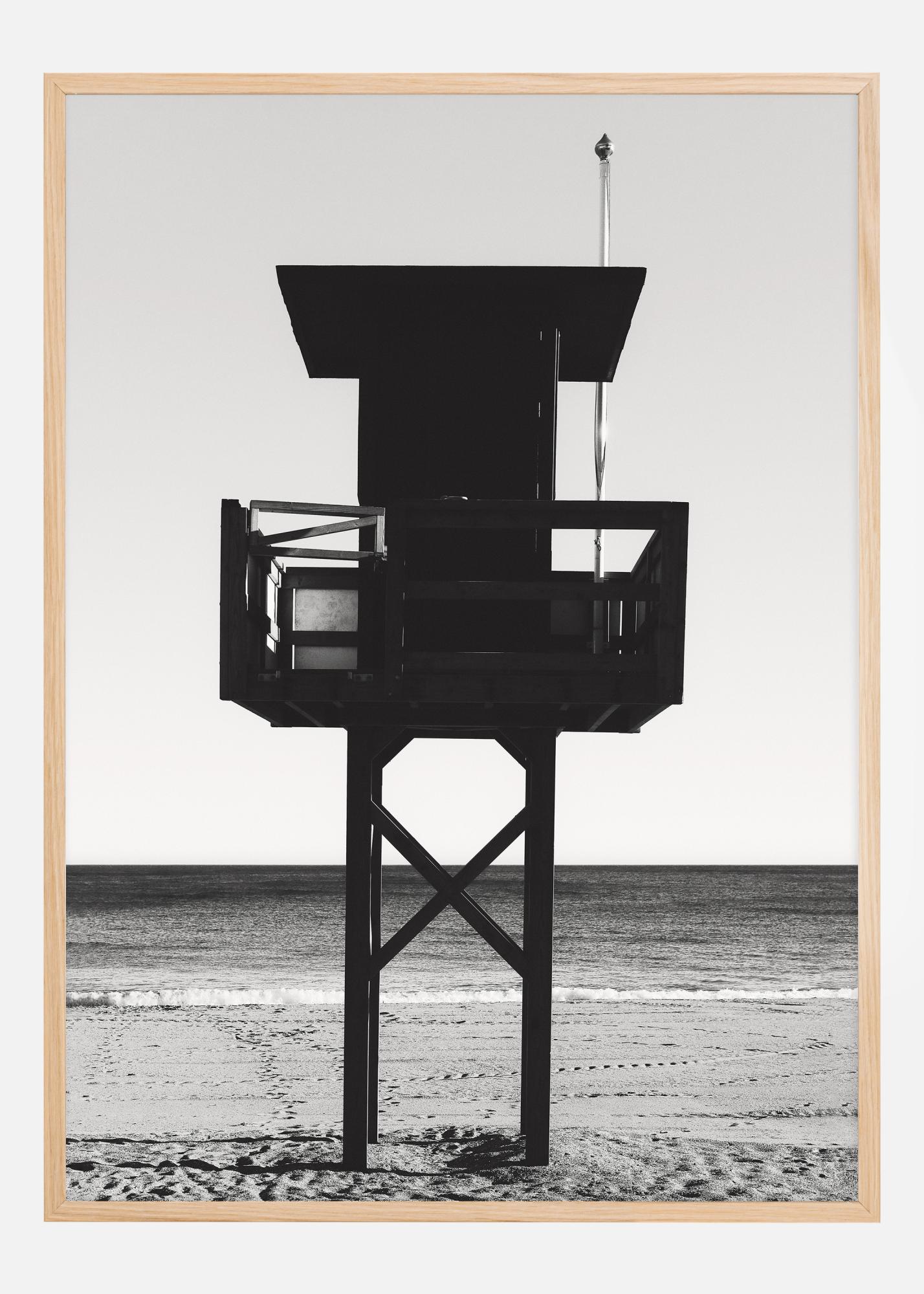 Αυτή η μονόχρωμη αφίσα παρουσιάζει μια εμβληματική σιλουέτα ενός πύργου ναυαγοσώστη ενάντια στον καθαρό ουρανό και τη γαλήνια θάλασσα. Η έντονη αντίθεση μεταξύ του σκοτεινού πύργου και των φωτεινών τόνων της άμμου και του ουρανού προσδίδει στην εικόνα μια γραφική ποιότητα που είναι εντυπωσιακή και επίκαιρη. Η εικόνα, η οποία έχει τραβηχτεί στο ύψος των ματιών, δημιουργεί μια αίσθηση παρουσίας και ηρεμίας, σαν να στέκεται κανείς απευθείας στην παραλία και να κοιτάζει τη τεράστια θάλασσα.