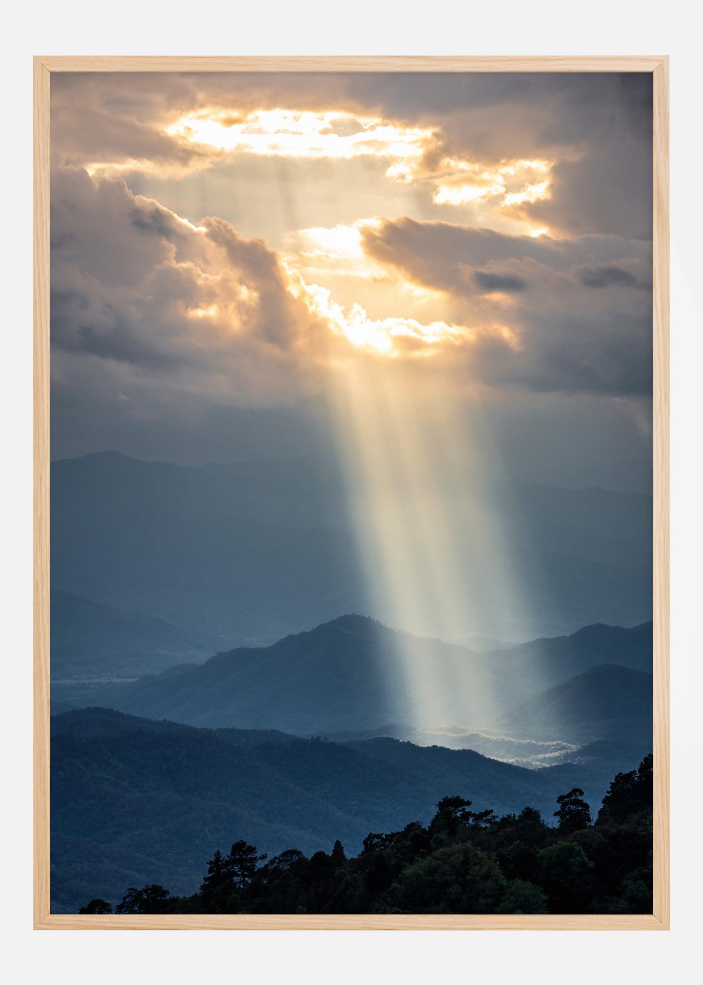 Αυτή η εμπνευσμένη αφίσα απεικονίζει ένα μεγαλοπρεπές τοπίο όπου οι ακτίνες του ήλιου διαπερνούν τα σύννεφα και φωτίζουν τα κυματιστά βουνά. Είναι μια σκηνή που αιχμαλωτίζει την υποβλητική ομορφιά της φύσης, με έναν δραματικό ουρανό που έρχεται σε αντίθεση με τα απαλά περιγραμμένα βουνά. Σκιές και φως παίζουν στο τοπίο δημιουργώντας μια ισχυρή αίσθηση βάθους και χώρου.