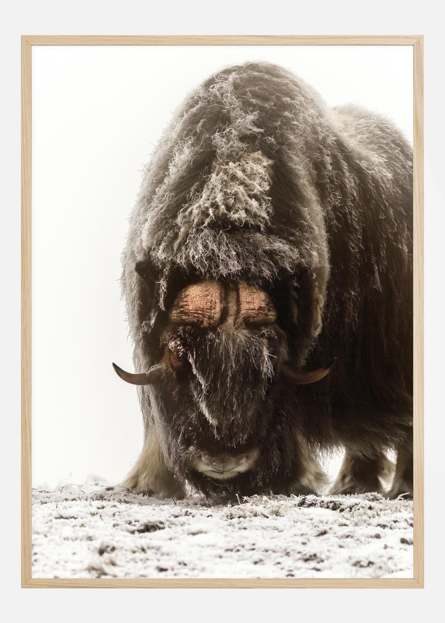 Μια αφίσα άγριας φύσης με ένα χιονισμένο γιάκ. Το μακρύ καφέ τρίχωμα του γιάκ φαίνεται μαλακό και πλούσιο καθώς στέκεται στραμμένο προς την κάμερα και ψάχνει για τροφή. Το χιονάτο φόντο τον κάνει να ξεχωρίζει και προσφέρει λίγο δράμα στην εικόνα. Κρεμάστε το αυτό στον τοίχο σας για μια χειμωνιάτικη αίσθηση.