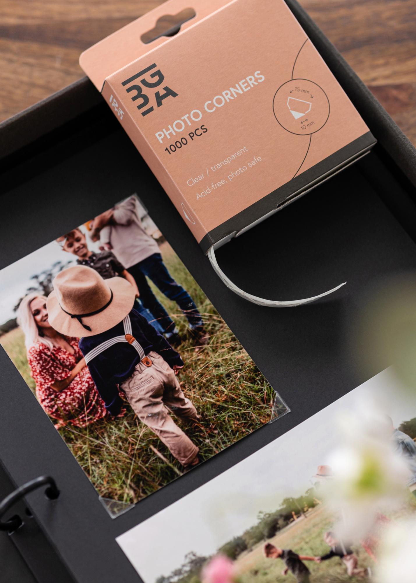 Οι γωνίες φωτογραφιών είναι τέλειες όταν, για παράδειγμα, θέλετε να τοποθετήσετε εικόνες σε ένα φωτογραφικό άλμπουμ και δεν θέλετε να χρησιμοποιήσετε κόλλα. Δεδομένου ότι τις τοποθετείτε στις γωνίες της εικόνας, προστατεύετε επίσης αυτές από φθορές με το χρόνο. Το αποτέλεσμα είναι μια κομψή, ευέλικτη και αξιόπιστη τοποθέτηση των εικόνων σας.