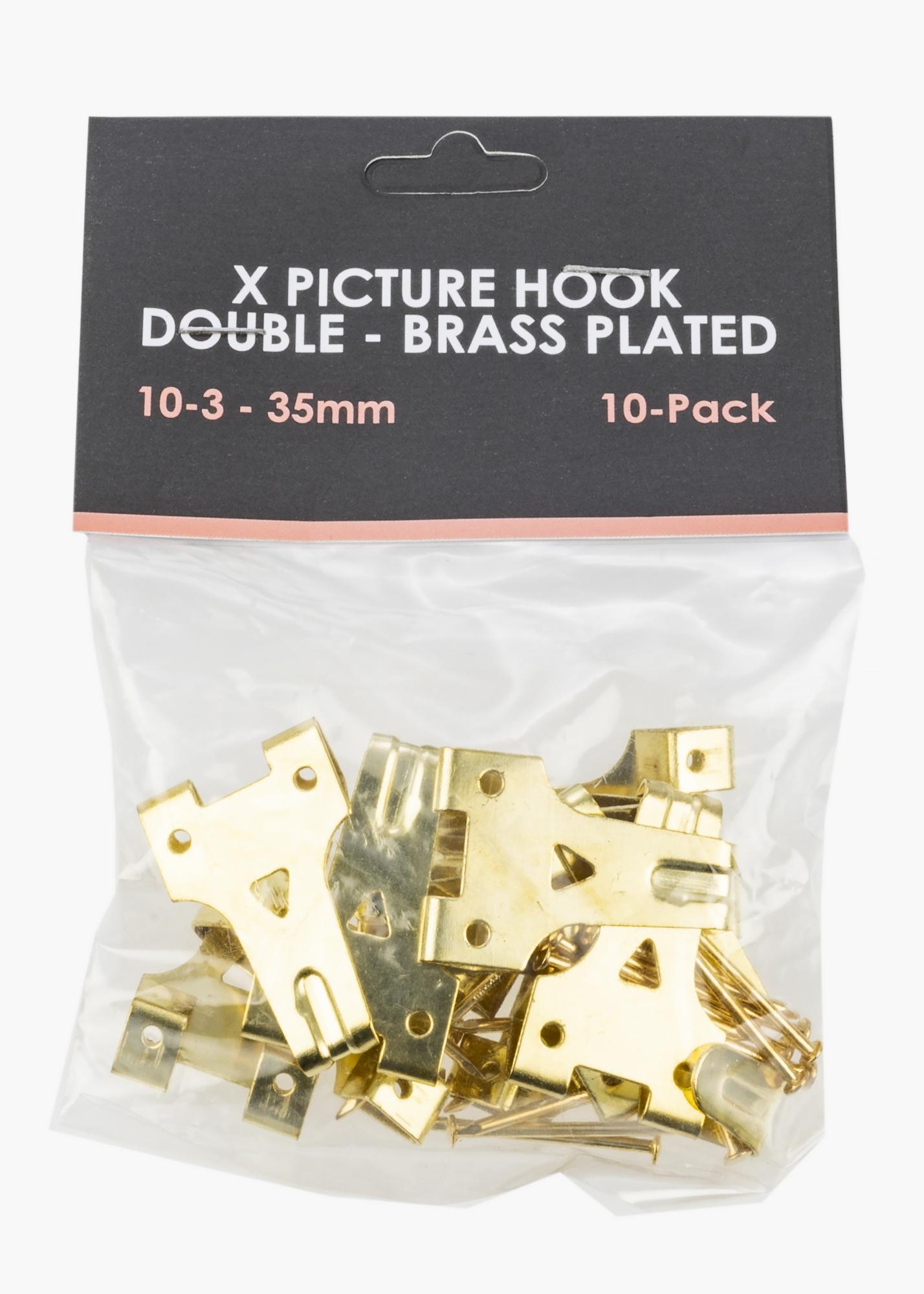 Διπλό άγκιστρο τύπου X για τοποθέτηση σε ξύλινο ή γυψοσανίδα. Αντέχει φορτίο μέχρι 10 κιλά. Ορειχάλκινο χρώμα.