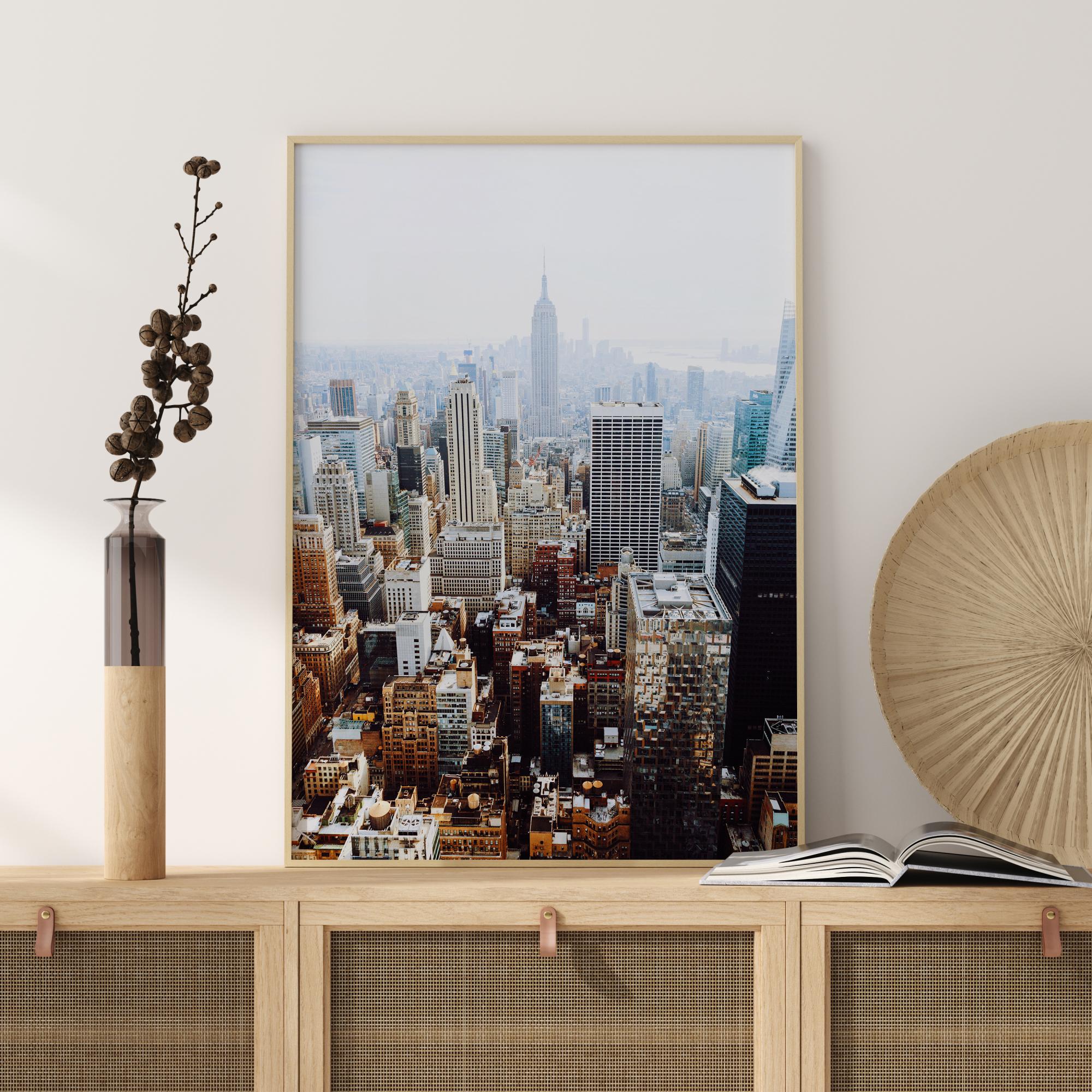 Μια αφίσα από αεροφωτογραφία του κέντρου της Νέας Υόρκης με το Empire State Building στο βάθος. Στο προσκήνιο ξεκινούν τα χρώματα ως χρυσά και κίτρινα πριν αναμειχθούν στο παρασκήνιο με ψυχρότερους μπλε και γκρι τόνους. Είναι το μειούμενο εστιακό βάθος της εικόνας που δημιουργεί το βάθος. Φέρτε αυτό το έργο στο σπίτι και απολαύστε μια καλλιτεχνική έκφραση της ζωής στην πόλη.