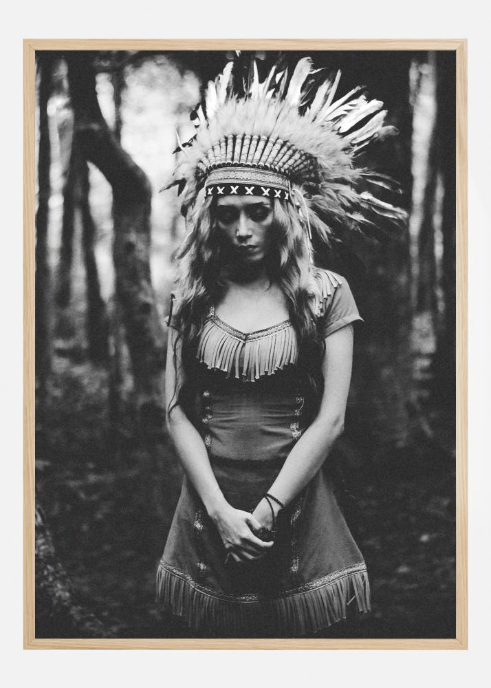 Μια αφίσα πορτρέτου με ένα κορίτσι Ινδιάνων στο δάσος. Αυτή η δυνατή ασπρόμαυρη εικόνα επιτρέπει στα λευκά φτερά του καπέλου να ξεχωρίζουν μπροστά από τον σκοτεινό κορμό του δένδρου. Αφήστε τον εαυτό σας να ζήσει μια στιγμή περισυλλογής όταν εκείνη κατεβάζει το βλέμμα της προς τα δεμένα της χέρια.
