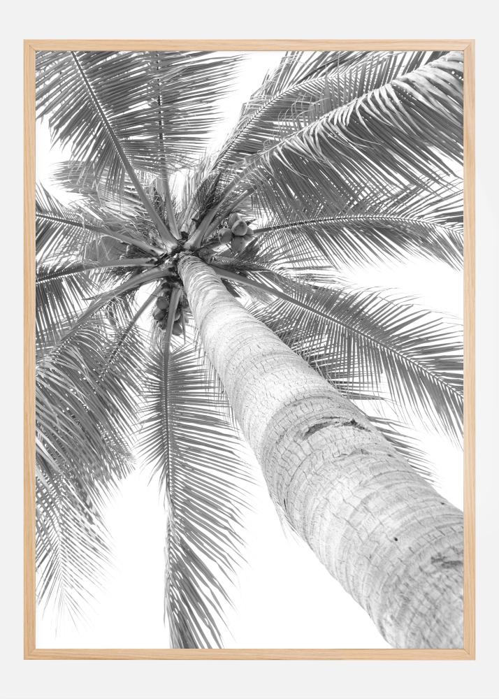 Αυτή η μινιμαλιστική και κομψή ασπρόμαυρη αφίσα δείχνει έναν φοίνικα από μια ασυνήθιστη προοπτική, με το βλέμμα στραμμένο προς τον ουρανό. Η αντίθεση μεταξύ του λεπτομερούς φυλλώματος του φοίνικα και του ομαλού φλοιού δημιουργεί μια δυναμική υφή που συλλαμβάνει την ουσία της τροπικής ομορφιάς. Η ασπρόμαυρη επεξεργασία προσθέτει μια διαχρονική και εκλεπτυσμένη αίσθηση που αναβαθμίζει την διακόσμηση κάθε δωματίου.