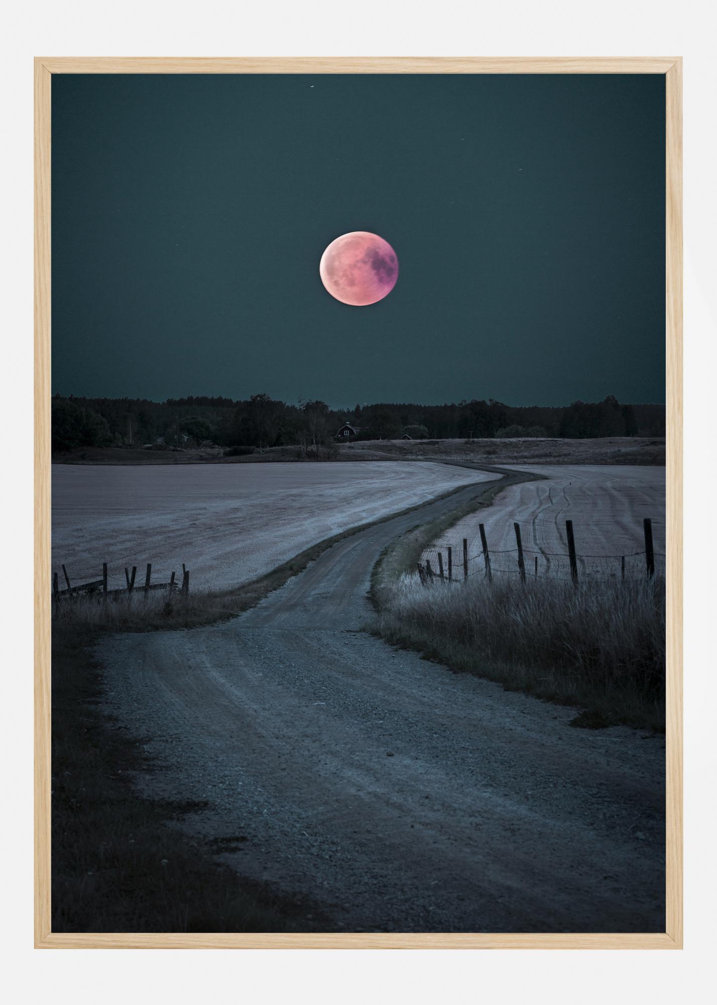 Μια φανταστική αφίσα με ένα χιονισμένο τοπίο και ένα φωτεινό κόκκινο ματωμένο φεγγάρι στο κέντρο. Ένας δρόμος οδηγεί μακριά στον ορίζοντα και τραβάει το βλέμμα προς το φεγγάρι που βρίσκεται χαμηλά στον ουρανό. Το γκρι και το μπλε έρχονται σε αντίθεση με το κόκκινο και το ροζ του φεγγαριού για να δημιουργήσουν μια αίσθηση δέους σε αυτή τη νυχτερινή εικόνα.