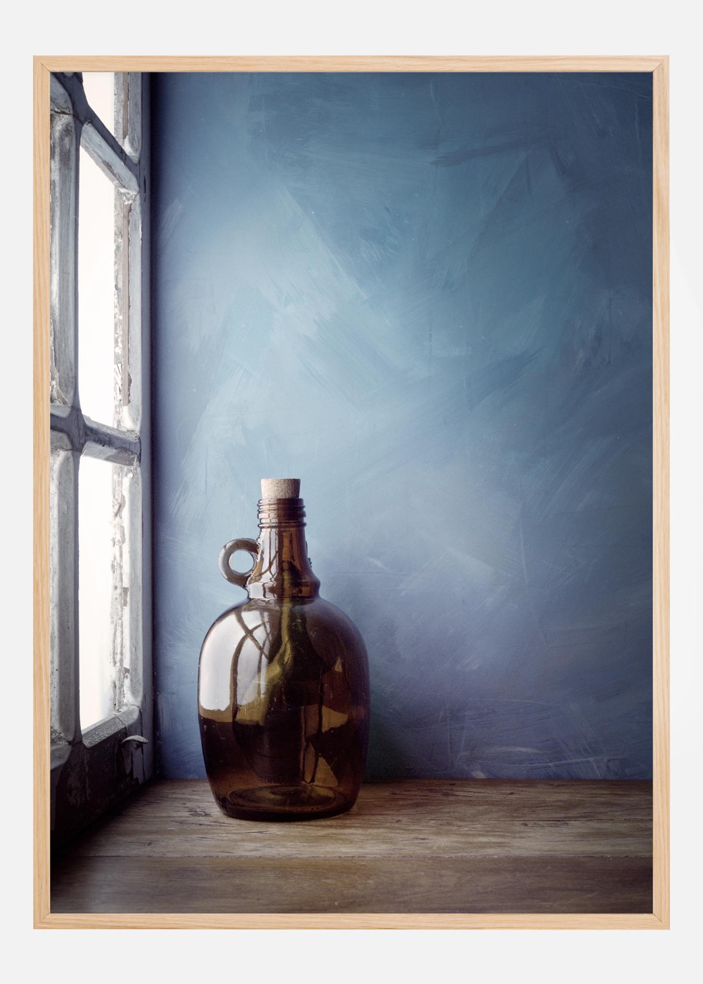 Μια αφίσα με μια καφέ φιάλη μπροστά σε έναν μπλε τοίχο. Το φως από ένα παράθυρο φωτίζει από τα αριστερά που φωτίζει τη φιάλη και δίνει αντανακλάσεις. Προσθέστε μια ρουστίκ αίσθηση στο σπίτι σας με τον απαλό μπλε τοίχο και το παλιό ξύλινο τραπέζι όπου βρίσκεται η φιάλη.