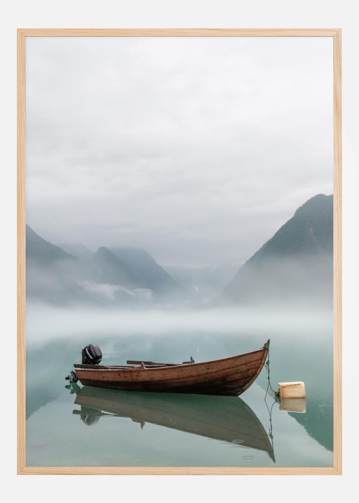 Μια κομψή αφίσα με μια βάρκα στη μέση μιας ομίχλης έλικας. Μια καφέ βάρκα ξεχωρίζει με σαφή λεπτομέρεια στο προσκήνιο με μια έντονη αντανάκλαση στο νερό. Στο φόντο περιτυλιγμένο σε ομίχλη στέκονται απαλά βουνά που αναδύονται από το νερό. Φέρτε την ηρεμία ενός ανοιχτού τοπίου στο σπίτι σας.