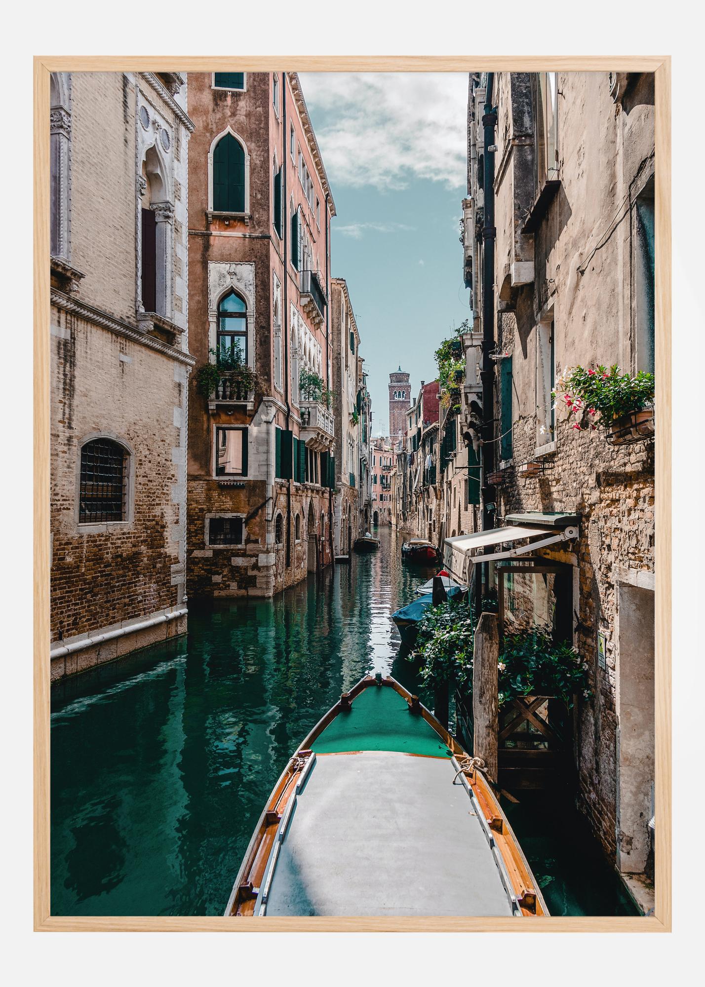 Αυτή η μαγευτική αφίσα αιχμαλωτίζει την ουσία ενός γραφικού καναλιού στη Βενετία, με μια παραδοσιακή γόνδολα στο προσκήνιο. Το φως πέφτει όμορφα πάνω στις πολύχρωμες προσόψεις των γύρω κτιρίων, και οι αντανακλάσεις στο ήρεμο νερό δημιουργούν έναν καθρέφτισμα που είναι τόσο καθαρός όσο και μαγευτικός. Αποχρώσεις γήινων κόκκινων και πορτοκαλί τόνων στο τοιχοποιία των κτιρίων αντιπαρατίθενται με το ήρεμο υδάτινο μπλε-πρασινωπό χρώμα του καναλιού.