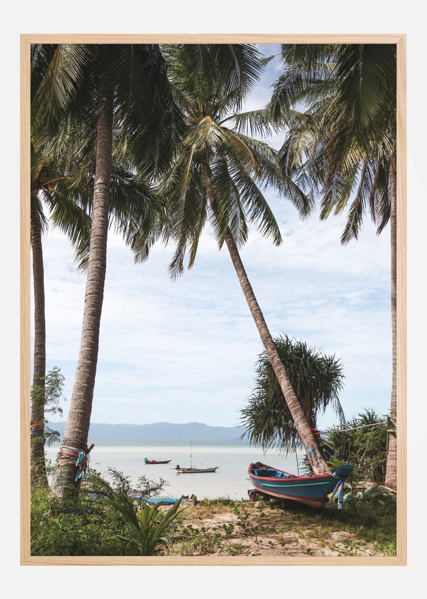 Μια αφίσα διακοπών με φοίνικες και βάρκες στην Ταϊλάνδη. Δύο φοίνικες κλίνουν ο ένας προς τον άλλον, πλαισιώνοντας τη θάλασσα πίσω, όπου βρίσκονται δύο βάρκες. Ένα τρίτο κόκκινο και μπλε σκάφος βρίσκεται στην ξηρά που τραβάει την προσοχή. Φανταστείτε ότι στέκεστε στην παραλία ενώ κοιτάτε αυτήν την ήρεμη εικόνα.