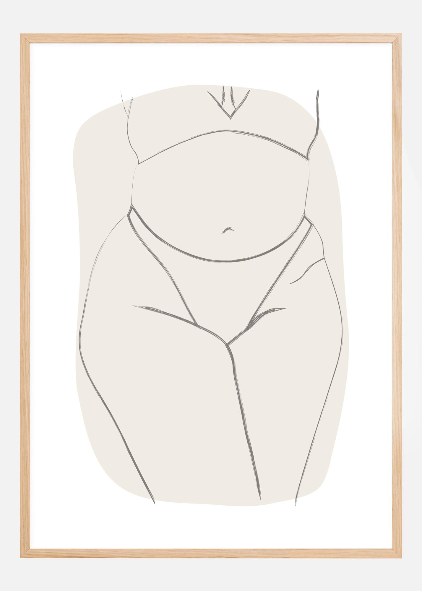 Μια απλή αφίσα με ένα σχέδιο της κοιλιάς και των ποδιών μιας γυναίκας. Οι γραμμές δείχνουν δειλά τα σταυρωμένα πόδια της γυναίκας όταν φοράει ένα απλό μπικίνι. Επισημασμένες με ανοιχτό γκρι, οι δυνατές γραμμές προβάλλουν για να δημιουργήσουν ένα καλλιτεχνικό έργο. Συνδυάστε την εικόνα με έναν έγχρωμο τοίχο για το καλύτερο αποτέλεσμα.