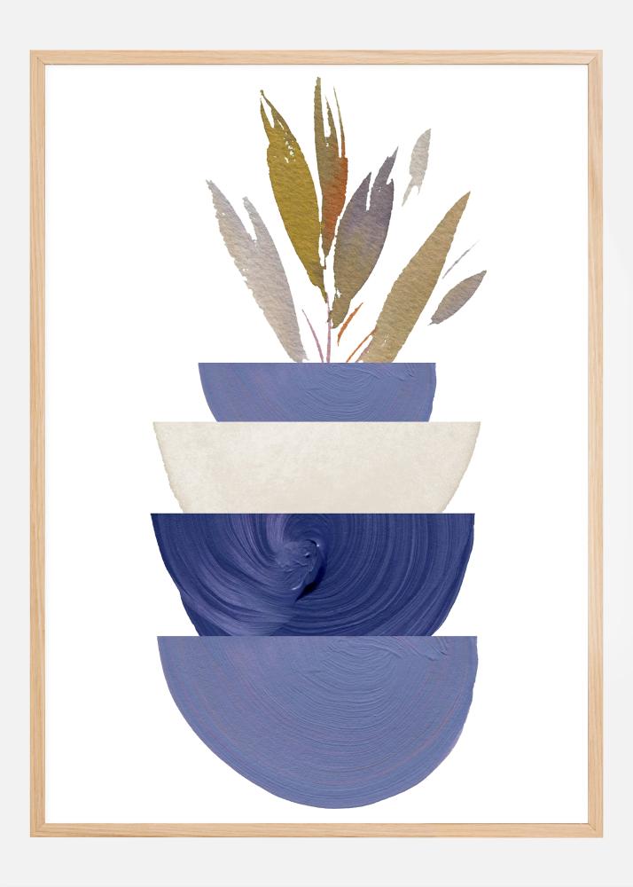 Αυτή η μοντέρνα και καλλιτεχνική αφίσα απεικονίζει ένα μποέμ μπολ σε μια μινιμαλιστική εκτέλεση, ιδανική για εκείνους που θέλουν να προσθέσουν μια αίσθηση ηρεμίας και μοντέρνου σχεδιασμού στο σπίτι τους. Το θέμα, που εστιάζει σε μια αρμονική αλληλεπίδραση μεταξύ μορφής και χρώματος, αναδεικνύει ένα μεγάλο μπολ σε αποχρώσεις του μπλε με μια διακριτική και κυματιστή υφή που γεμίζει το κάτω μέρος της εικόνας. Πάνω στο μπολ αναπαύεται μια πλατφόρμα σε μια ουδέτερη μπεζ απόχρωση, πάνω στην οποία βρίσκεται ένα άλλο μικρότερο μπολ σε πιο σκούρα μπλε απόχρωση.