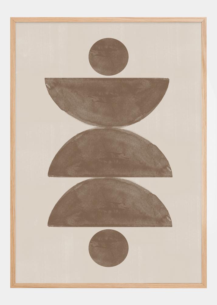 Αυτή η καταπραϋντική και αισθητικά ικανοποιητική αφίσα παρουσιάζει μια αρμονική στοίβαξη απαλών γεωμετρικών σχημάτων. Δύο ημισέληνοι σε μια γήινη καφέ απόχρωση ισορροπούνται από δύο πλήρεις κύκλους, τοποθετημένους συμμετρικά από πάνω και κάτω. Αυτή η μινιμαλιστική σύνθεση προσφέρει μια αίσθηση ηρεμίας και είναι μια τέλεια απεικόνιση του μποέμ στυλ με μια απαλή και μοντέρνα προσέγγιση.