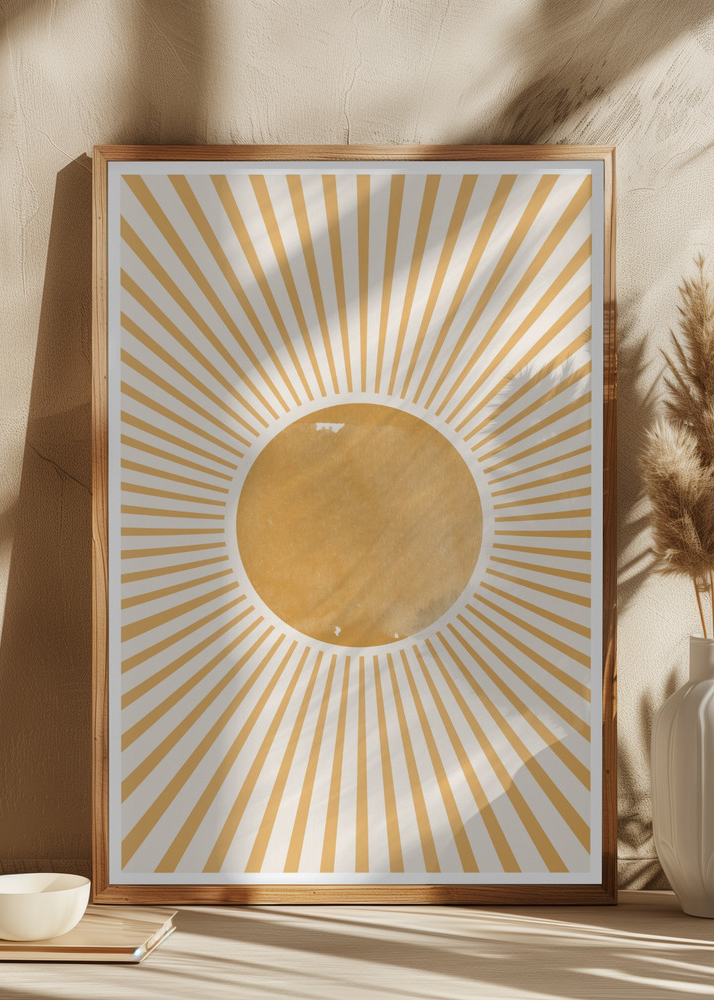 Αυτή η ζωντανή αφίσα προκαλεί την αίσθηση ενός λαμπρού ήλιου με τις εκπεμπόμενες γραμμές της σε αποχρώσεις του χρυσού που περιβάλλουν έναν κεντρικό κίτρινο κύκλο σε ένα απαλό λευκό φόντο. Ο σχεδιασμός είναι εμπνευσμένος από μποέμ και γεωμετρικά μοτίβα, που συνδυαστικά δημιουργούν μια εικόνα της ζεστασιάς και της ενέργειας του ήλιου. Τα ζεστά χρώματα και το λαμπερό μοτίβο έχουν σχεδιαστεί για να προσφέρουν μια αίσθηση χαράς και θετικότητας.