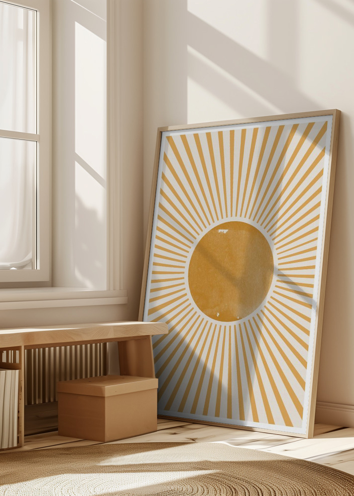 Αυτή η ζωντανή αφίσα προκαλεί την αίσθηση ενός λαμπερού ήλιου με τις ακτινωτές γραμμές της σε χρυσούς τόνους που περιβάλλουν έναν κεντρικό κίτρινο κύκλο σε ένα απαλό λευκό φόντο. Ο σχεδιασμός είναι εμπνευσμένος από μποέμ και γεωμετρικά μοτίβα, που μαζί δημιουργούν μια εικόνα της ζεστασιάς και της ενέργειας του ήλιου. Τα θερμά χρώματα και το ακτινοβόλο μοτίβο έχουν σχεδιαστεί για να προσφέρουν μια αίσθηση χαράς και θετικότητας.