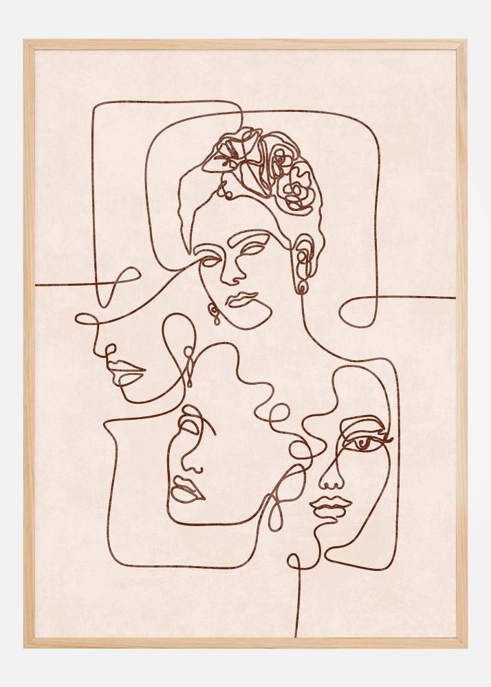 Δώστε στο σπίτι σας μια καλλιτεχνική ώθηση με αυτήν την κομψή αφίσα που υμνεί την ομορφιά και τη δύναμη της θηλυκότητας. Σε μια ενιαία, αλληλένδετη γραμμή απεικονίζονται τέσσερα γυναικεία πρόσωπα ως μια εικόνα ενότητας και ποικιλομορφίας. Κάθε προφίλ παρουσιάζεται με μια απλότητα που μιλάει στη φαντασία του θεατή, καθιστώντας αυτή την αφίσα έναν τέλειο εκκινητή συζήτησης. Φορεμένη σε μια εκλεπτυσμένη μπεζ απόχρωση, το υπόβαθρο προσφέρει μια αίσθηση ζεστασιάς και απαλότητας, ενώ οι καφέ γραμμές προσφέρουν ισχυρή οπτική αντίθεση.