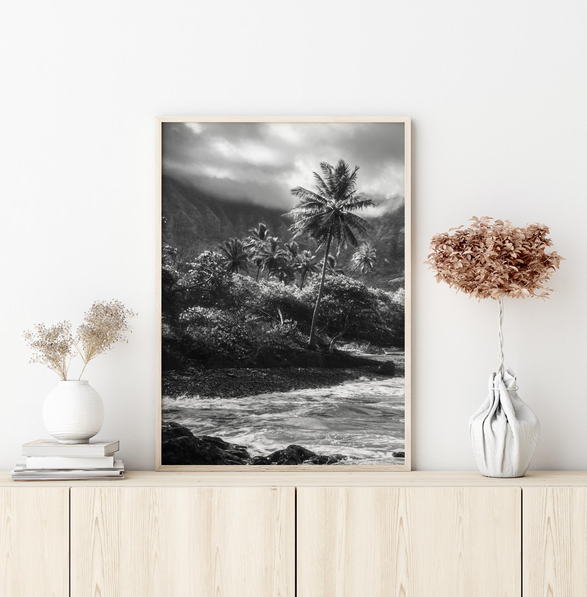 Μια αφίσα φύσης με μια επικείμενη καταιγίδα όπου η θάλασσα συναντά τη στεριά. Ένας συννεφιασμένος ουρανός σκιάζει τη φωτογραφία ενώ οι φοίνικες λικνίζονται στον άνεμο. Μια αφρισμένη θάλασσα χτυπά την πετρώδη παραλία για επιπλέον δραματικότητα. Δημιουργήστε λίγο δράμα στο σπίτι με αυτό το ασπρόμαυρο έργο σε έναν ουδέτερο τοίχο.