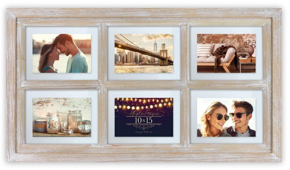 Οριζόντια κορνίζα collage από ανοιχτόχρωμο ξύλο. Αυτή είναι μια κορνίζα που χωρά 6 φωτογραφίες με διαστάσεις εικόνας 10x15 εκ., και σας επιτρέπει να οργανώσετε εύκολα μια ομάδα εικόνων μαζί με έναν όμορφο τρόπο. Η κορνίζα έχει μερικές ξύλινες λεπτομέρειες που της δίνουν έναν ρουστίκ αλλά ταυτόχρονα επαρχιακό χαρακτήρα. Οι εξωτερικές διαστάσεις της κορνίζας είναι 38,5x69,5 εκ. Υπάρχει στήριγμα τοίχου.