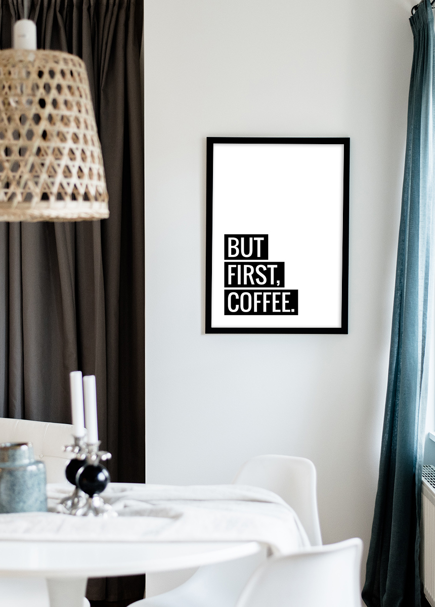 Ταξιδέψτε σε όλο τον κόσμο, ξεκινήστε τη δική σας επιχείρηση, μάθετε να κάνετε ζογκλέρ ενώ ισορροπείτε σε μια εξαιρετικά λεπτή γραμμή! Αλλά πρώτα – καφές. Αυτή η κομψή αφίσα είναι για εσάς που βλέπετε το υπέροχο ποτό ως σημαντικό κομμάτι της καθημερινής ζωής. Κρεμάστε την πάνω από το τραπέζι της κουζίνας ή στο γραφείο! Η αφίσα είναι λευκή με το κείμενο ”Αλλά πρώτα, καφές” σε λευκό πάνω σε μαύρο φόντο. Ο ασπρόμαυρος σχεδιασμός λειτουργεί άψογα μαζί με μια κορνίζα ή πάσο σε ένα ενδιαφέρον χρώμα. Επιλέξτε μεταξύ 6 διαφορετικών μορφών.