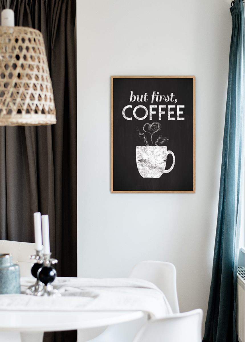 Δεν μπορείς να χορτάσεις τον καφέ; Τότε αυτή είναι η αφίσα για να διακοσμήσεις το σπίτι σου. Ή γιατί όχι να διακοσμήσεις τον τοίχο στο δωμάτιο διαλείμματος στη δουλειά και ταυτόχρονα να διευκρινίσεις την προτεραιότητα στη σειρά στην επιχείρηση. Η ασπρόμαυρη γραφική εκτύπωση έχει έναν κομψό σχεδιασμό που ταιριάζει όμορφα σε όλους τους τύπους περιβάλλοντος όπου μπορεί να υπάρχει καφές και μπορεί να τοποθετηθεί τόσο μόνη της όσο και σε έναν τοίχο με θέμα καφέ. Αγοράστε μια απλή μαύρη κορνίζα που αναδεικνύει το θέμα και ενισχύει την εντύπωση μιας μαυροπίνακας.